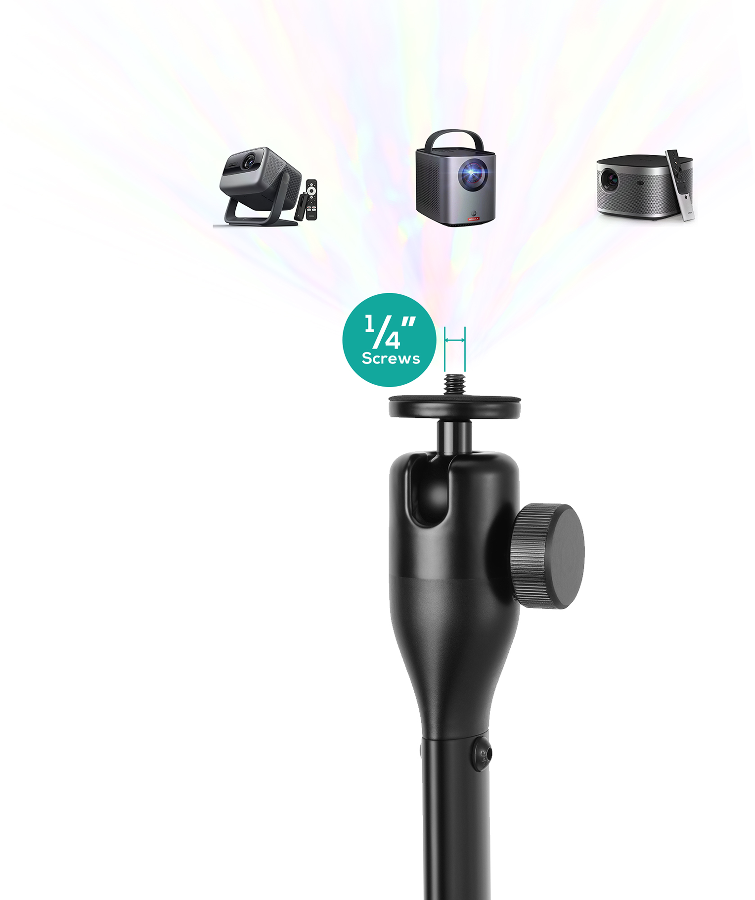 The activiva Mini Projector Floor Stand offers 360° rotation, adjustable height, and universal compatibility with most projectors using ¼” screws. Its sturdy steel construction, built-in storage shelf, and integrated cable management make it an ideal addition to any home theatre setup, supporting popular brands like XGIMI, Nebula, and JMGO.