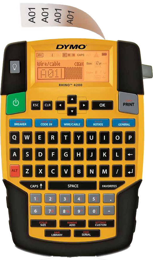 The new DYMO® Rhino? 4200 gets labelling jobs done fast ? and done right. Easily navigate the familiar QWERTY keyboard. Use one-touch ?Hot Key? shortcuts to quickly create and format wire/cable wraps, flags, Code 39 and Code 128 barcodes, fixed-Length labels, breaker labels and more.