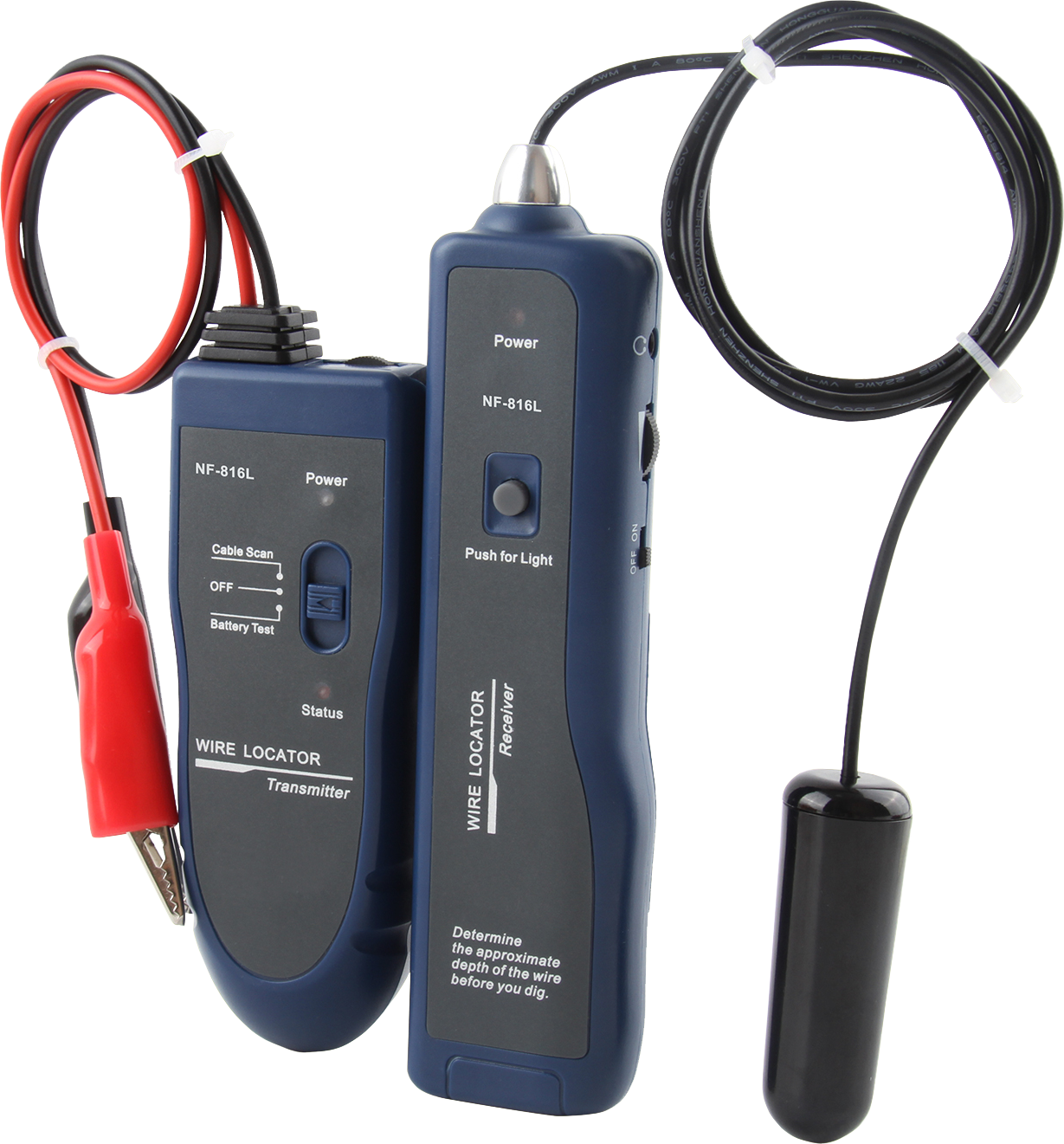 This underground cable wire locator NF816L is designed to locate and trace low voltage cables buried and hidden wires underground such as for garden lightning systems and landscape automatic watering systems. It can also be used to trace other metal cables either underground or in-wall wires. The detection depth range is 60cm (2 feet) and the maximum cable length is 600M (2000 feet).