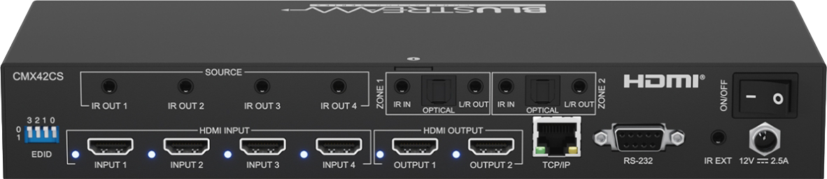 Supporting full HDMI 2.0 with HDCP 2.2 compliance, the CMX42CS enables the reliable distribution of up to four HDMI source devices to two independent HDMI outputs. All video resolutions up to 4K UHD at 60Hz 4:4:4 (18Gbps) are supported, ensuring full compatibility with the latest UHD and HDR content.