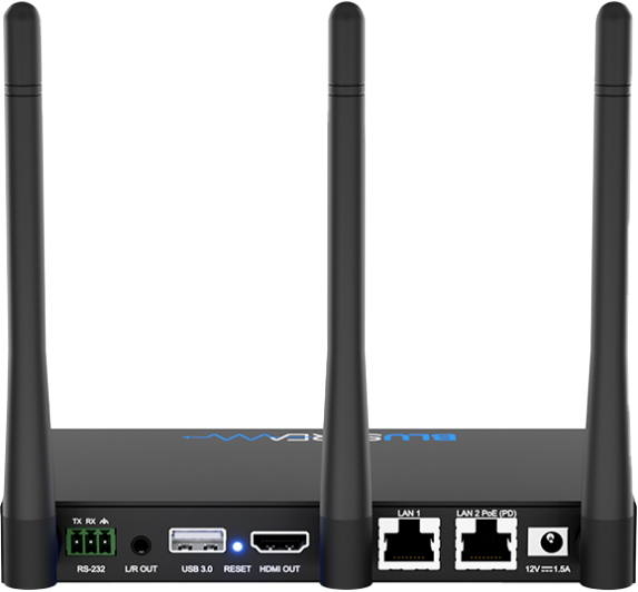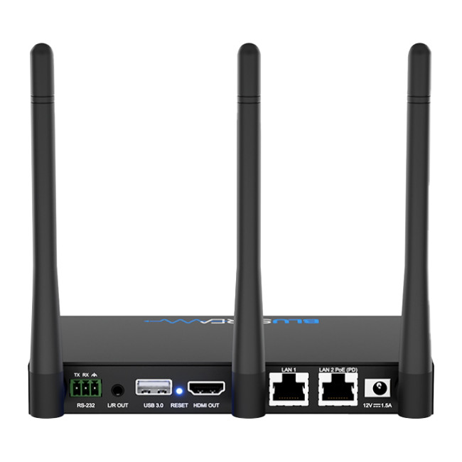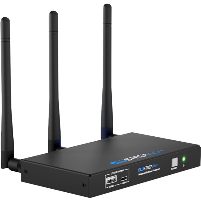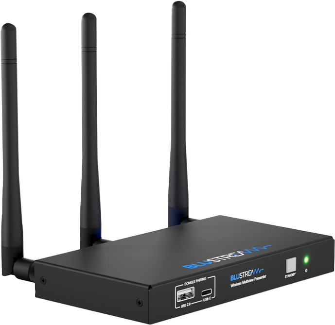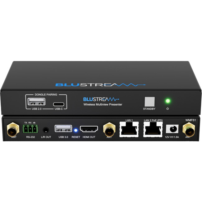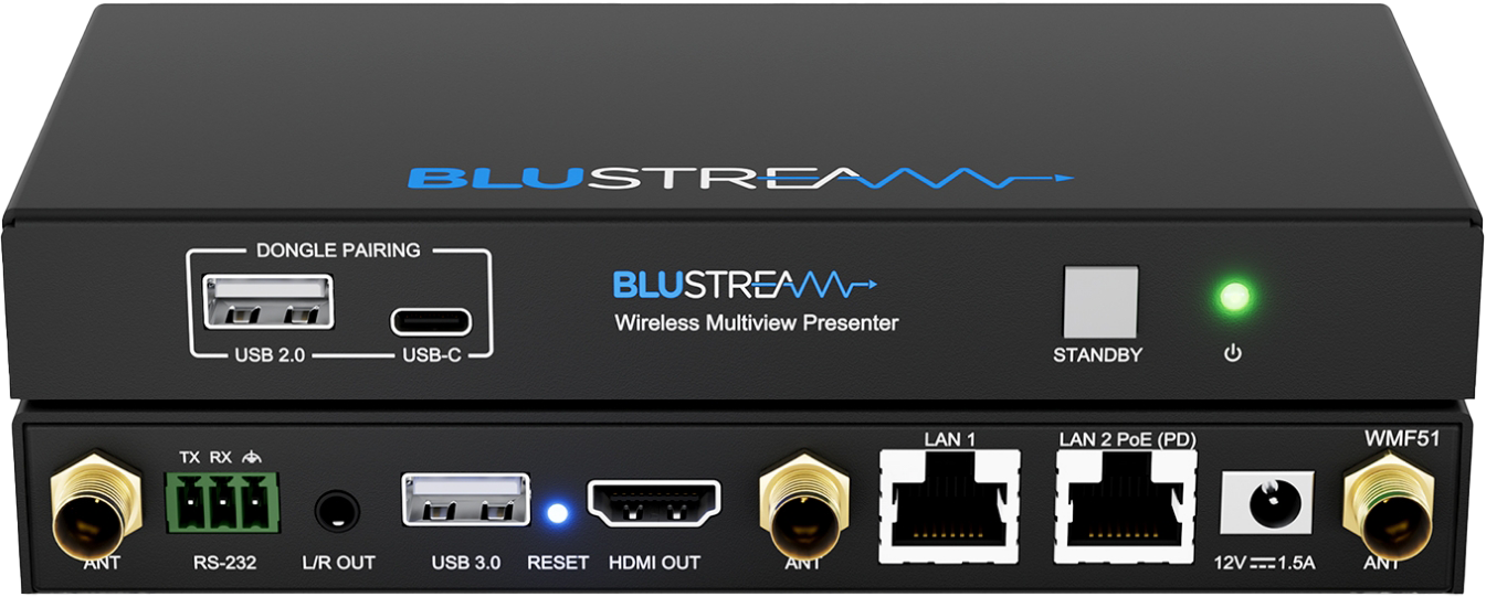 The WMF51 is a 4K multi-format presentation switch featuring AirPlay, Miracast® and Chromecast® inputs to a single HDMI output. The WMF51 provides enhanced features including multi-view presentation, video scaling, a web-GUI for control and configuration, localised 2.4/5G WiFi hotspot and dual LAN connectivity. The WMF51 also features OSD control, USB touch-back to connected host device, whiteboard and screen overlay annotation, with manual or automated source selection. The WMF51 can be controlled via front panel, RS-232 or TCP/IP. The WMF51 is also compatible with Blustream WMF-USBC and WMF-HDMI plug and play wireless dongles, providing an ideal BYOD solution for your boardroom, classroom, or huddle-space application.
