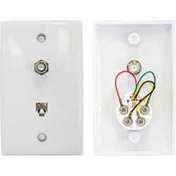 F' Type Socket to Socket - 6P4C telephone connector. Front: 'F' Socket; 6P4C Jack Rear: 'F' Socket; 4x Screw terminals