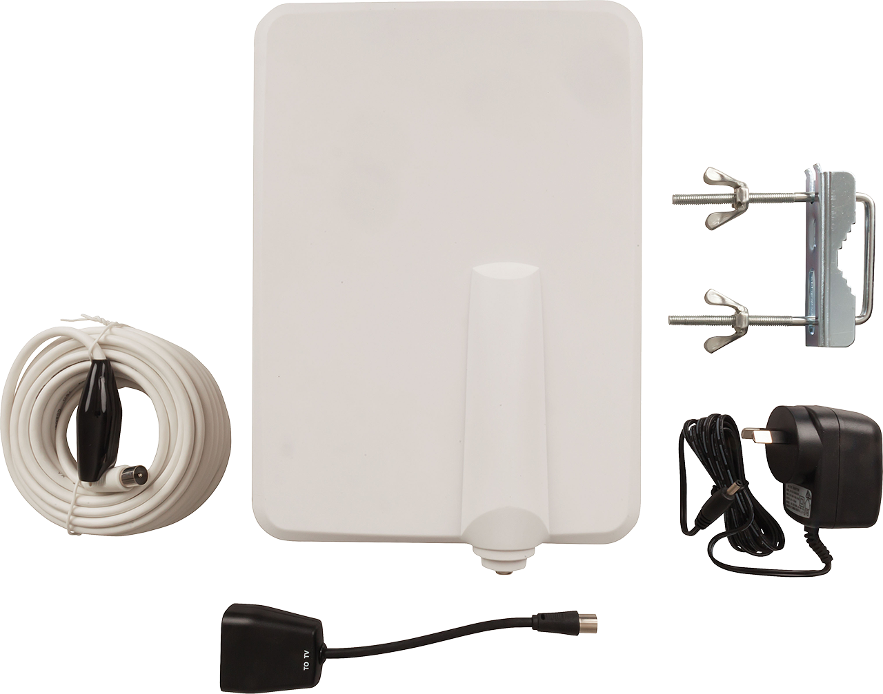 Included: 1 x Indoor /Outdoor UHF/VHF Antenna 1 x 4m F to F Antenna Cable 1 x 4m F to PAL Antenna Cable 1 x Flat Window Antenna Cable 1 x Power Injector 1 x Mains Power Adaptor 1 x Mast/Rail Clamp 1 x Mast/Rail & Wall Mounting Hardware