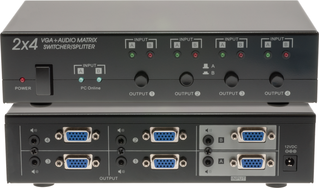 The PRO1338 VGA Matrix is perfect for larger installations where multiple displays or projectors are required. Each of the four outputs can independently displayeither of the two inputs. Perfect for classroom and demonstration rooms, conferences and houses of worship, and even restaurant or shop displays! Great for huge impact in large environments using up to 4x projectors or for small conference rooms where several small monitors can be used.