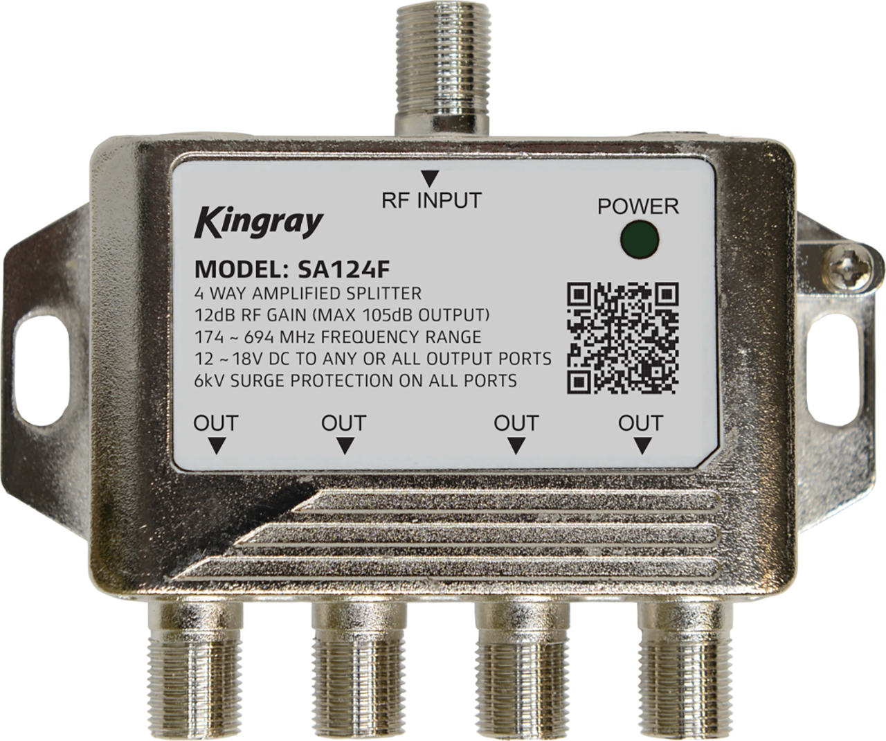 The Kingray range of amplified splitters have been designed to have superior performance for today’s digital television signals. The characteristics of the components elected provide a very low noise figure, high output level and high return loss. The SA124F is a VHF/UHF splitter amplifier with a single input and four outputs, designed to be used when you have enough signal for one outlet but insufficient signal for two or more outlets. it is supplied with 1 adaptor & a power supply to remotely power the amplified splitter.