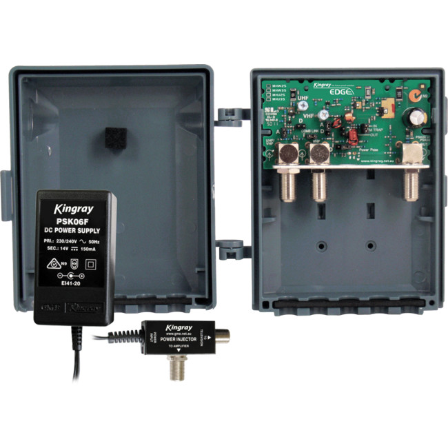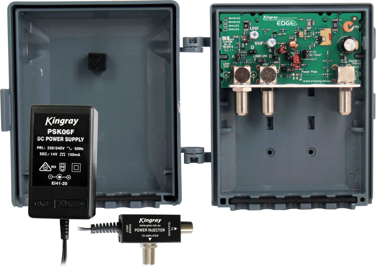The MHW35F is a VHF/UHF masthead amplifier with the capability to amplify signals either from a combined or separate VHF or UHF antenna; it has F connections is sheilded and is part of the Kingray Edge Series range.