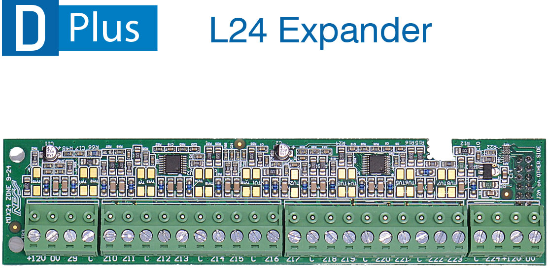 Simple and cost effective hardwired zone expansion. L24 Local Expander plugs into the DPlus main board providing an additional 16 zones - for a total of 24 hardwired zones at the base panel without zone doubling!