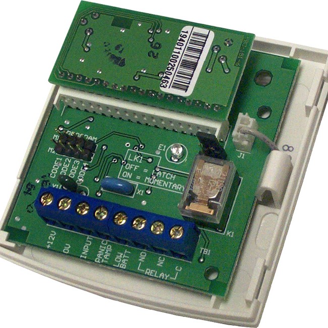 The Relay output can be selected to be Pulsing or Latchedfor alarm signals or a Pulsing output for Panic/Tamper, Aux or Low Batt signals. The SCR will accept up to four individual Radio Keys and Panic Buttons or up to four alarm transmitting devices (Radio Reed Switches or PIRs)
