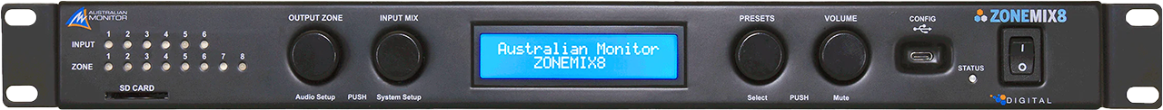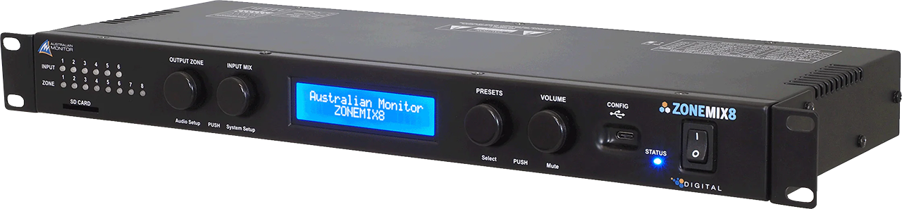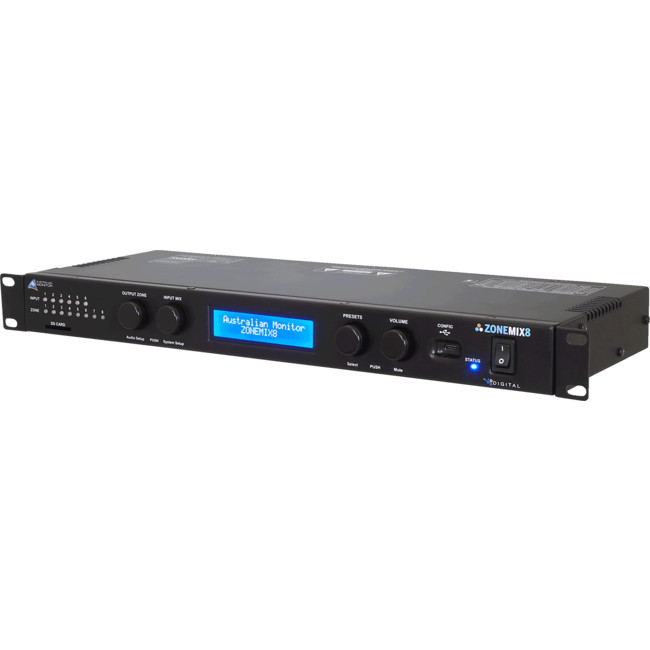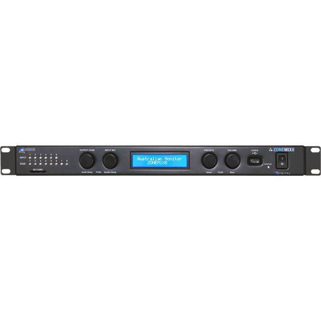The ZONEMIX8 provides a 8 zone mixing and paging solution featuring USB, Ethernet and RS232 connectivity.