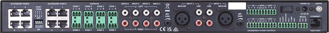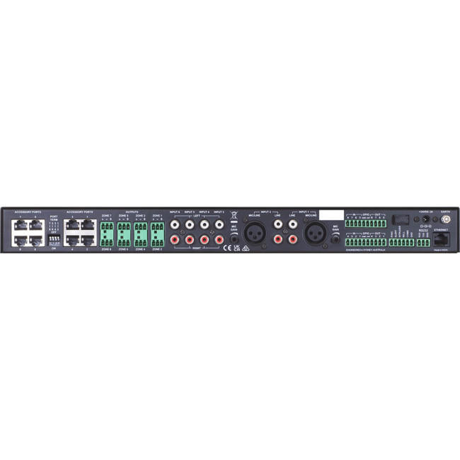It features 2 Mic/Line and 4 line level stereo inputs which can be independently mixed to any output zone. An additional local audio input can also be added to each zone using audio wall panel inputs.