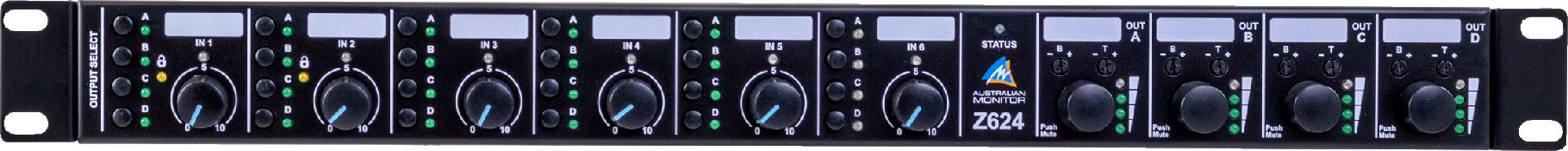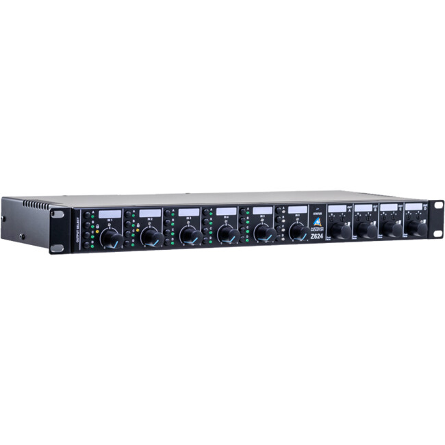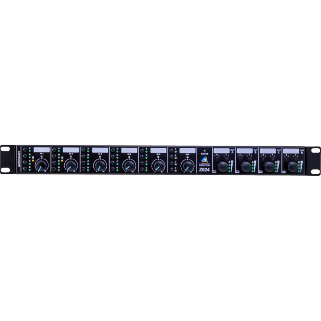 The Z624 is Australian Monitors entry level zoning solution featuring 6 Mic/Line inputs which can be independently mixed or matrixed to 4 output zones. Routing is achieved using an intuitive console style front panel.
