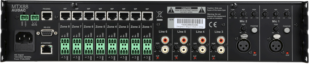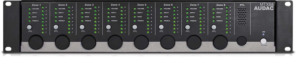 The MTX88 is the eight zone version of the MTX series, equipped with two balanced microphone inputswith priority function, phantom power possibility, and three-band tone control.