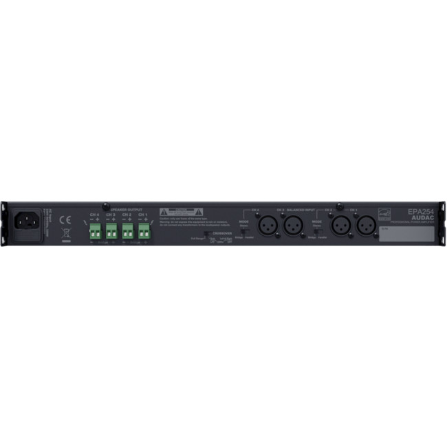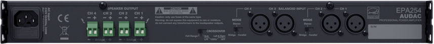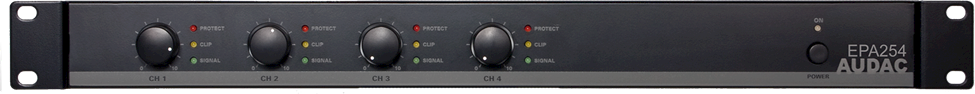 The EPA254 is built as a quad channel amplifier containing four individually controllable channels capable of delivering a power of 4 x 250 Watt in stereo mode.