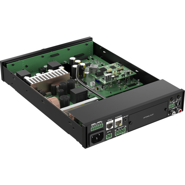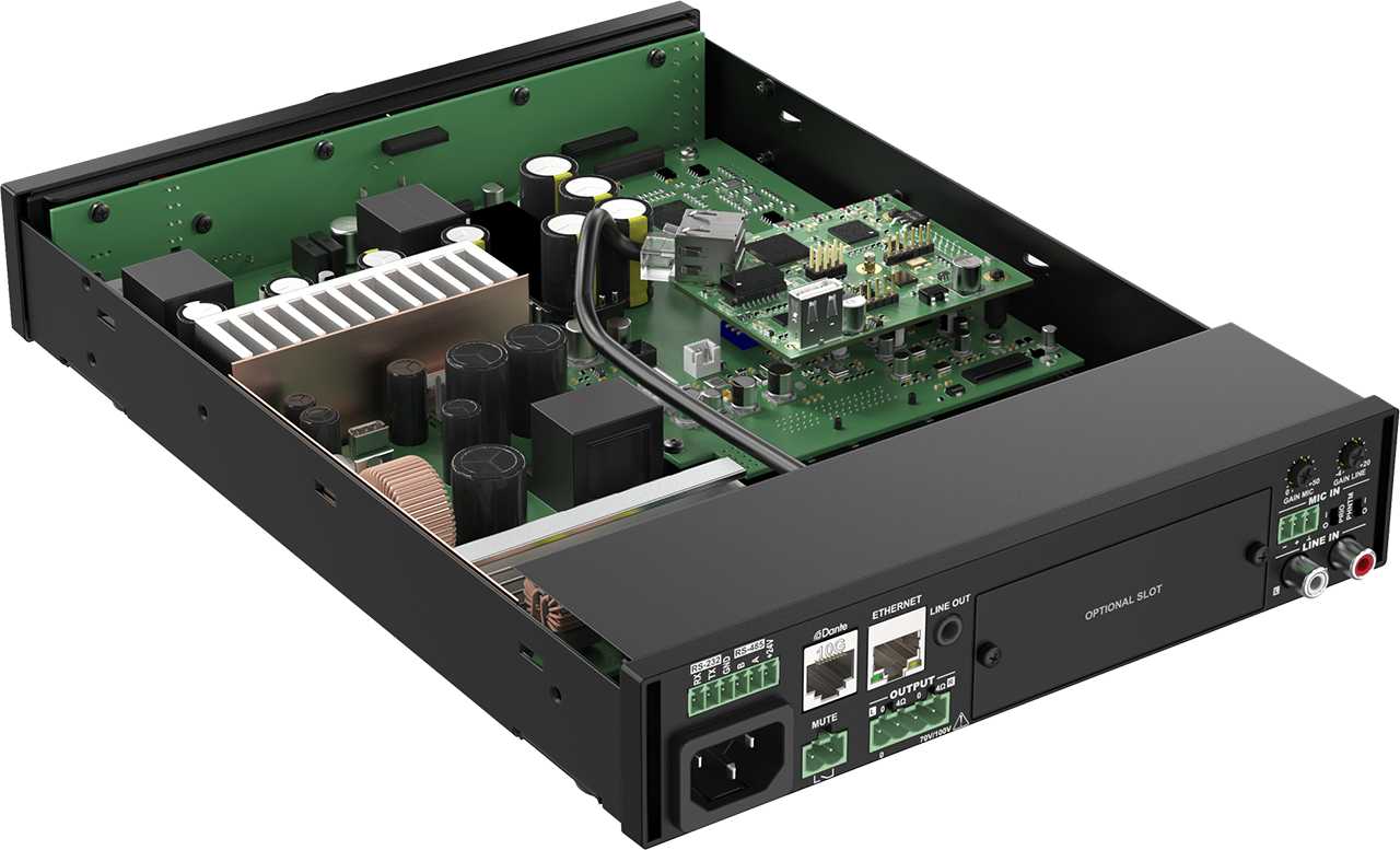 The installation of this optional module allows these amplifiers to be integrated into any Dante™ enabled AV network and flawlessly transfer digital audio with any compatible product on the market, ranging from music sources to microphone systems, mixers, and many more.