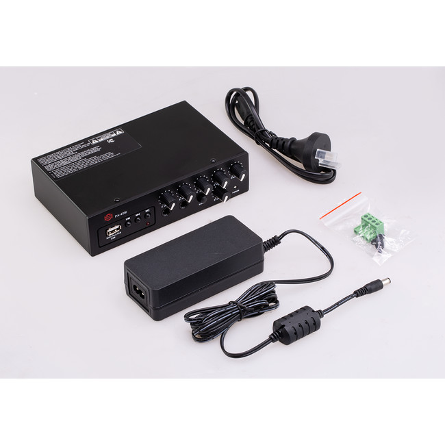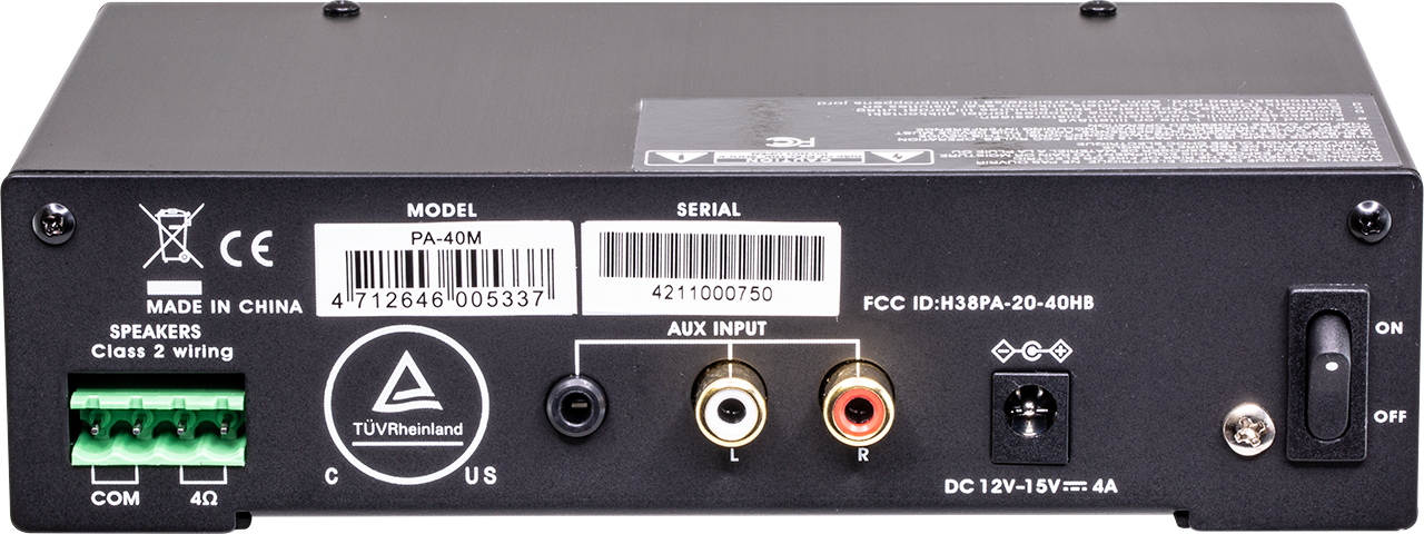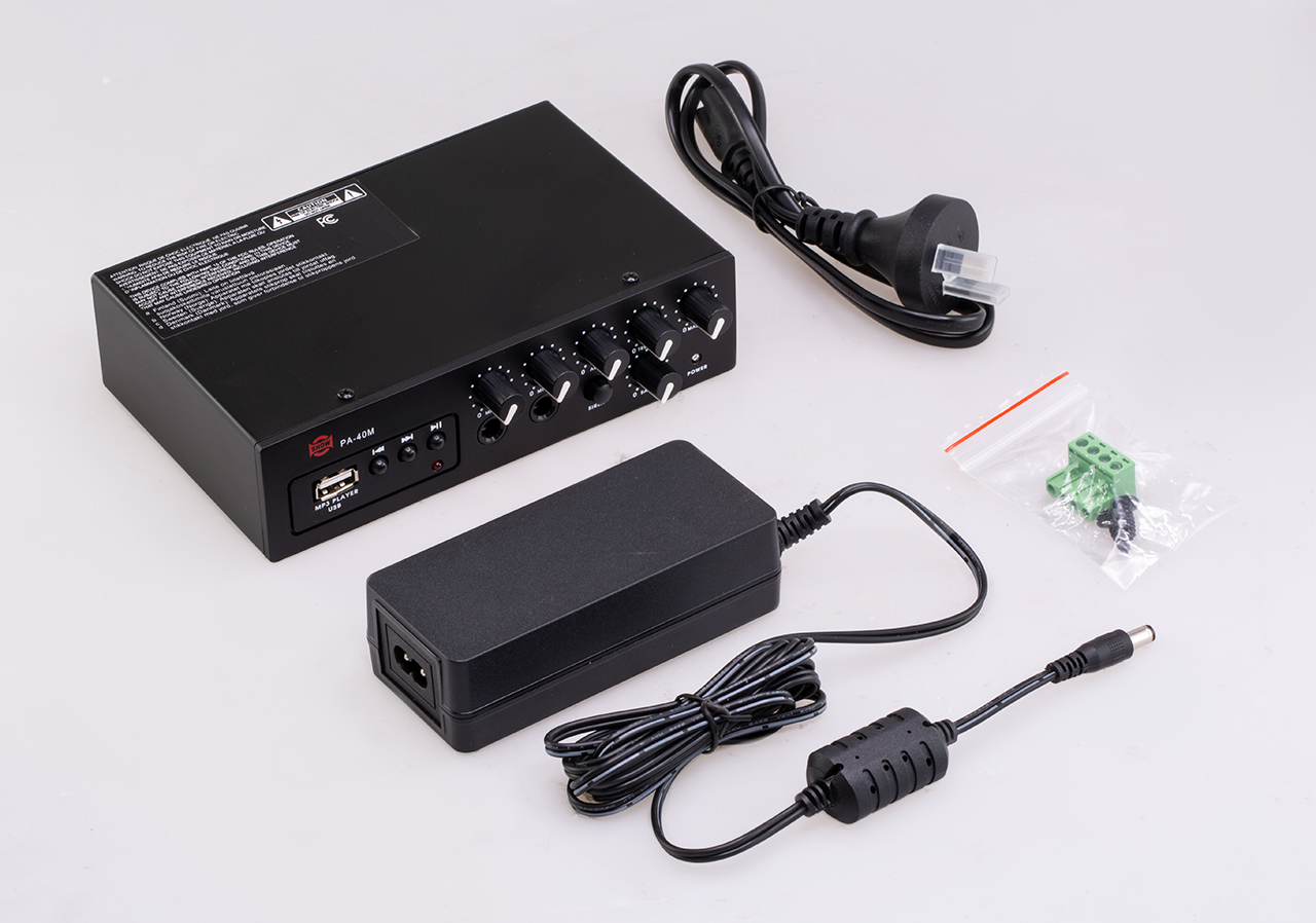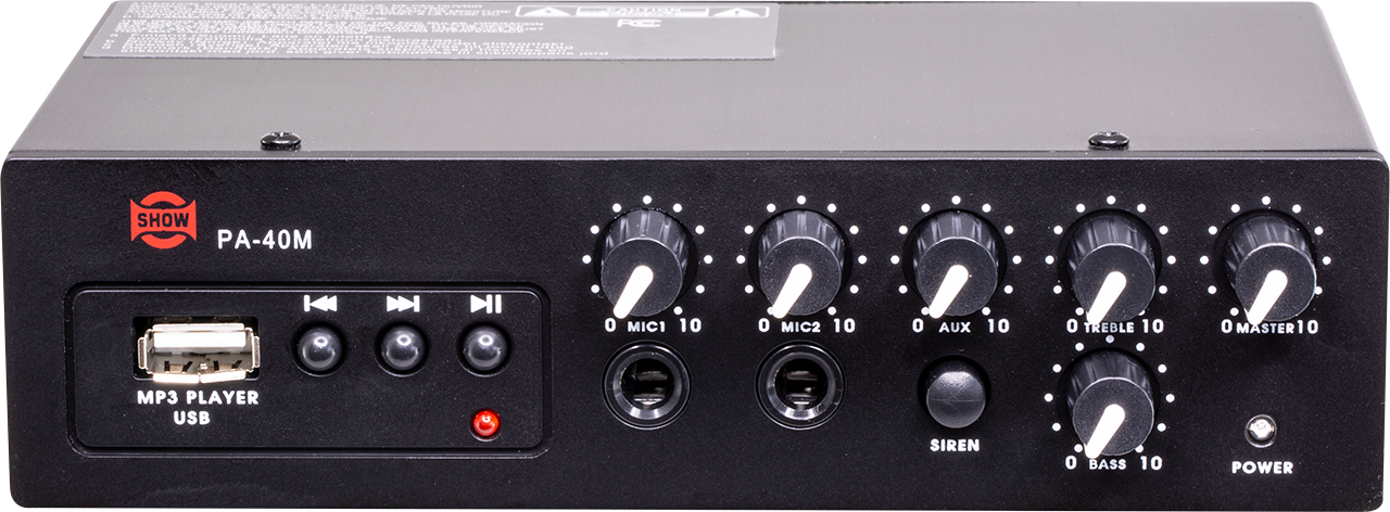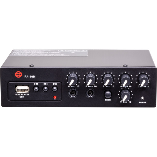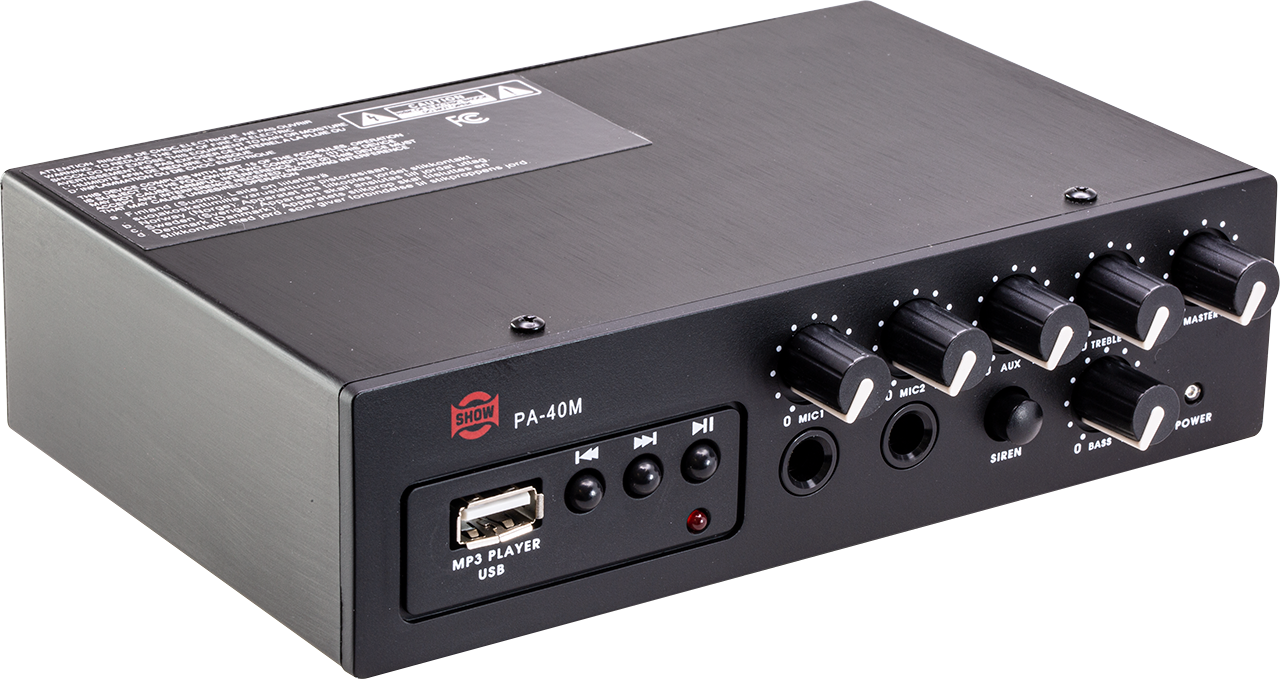 The PA-40M is a very compact amplifier specifically designed for small hotels and supermarkets, or mobile applications. Its small size and light weight make easy integration in little space. The 12V DC operation perfectly fits for portable use or installations where a direct AC power supply is unavailable. They are the ideal solutions for zoning, information points, ticketing counters, and vehicles using a rooftop speaker system. PA40M features an MP3 player with a UBS port, plus a siren triggered with a push button from the front panel. 2 Mic inputs are available with TRS 6.35mm jacks, plus 1 Aux stereo input on the rear panel with RCA connectors. All volume controls are on the front panel and include a simple EQ setting. The output section uses euro block connectors and features a 4Ω load.