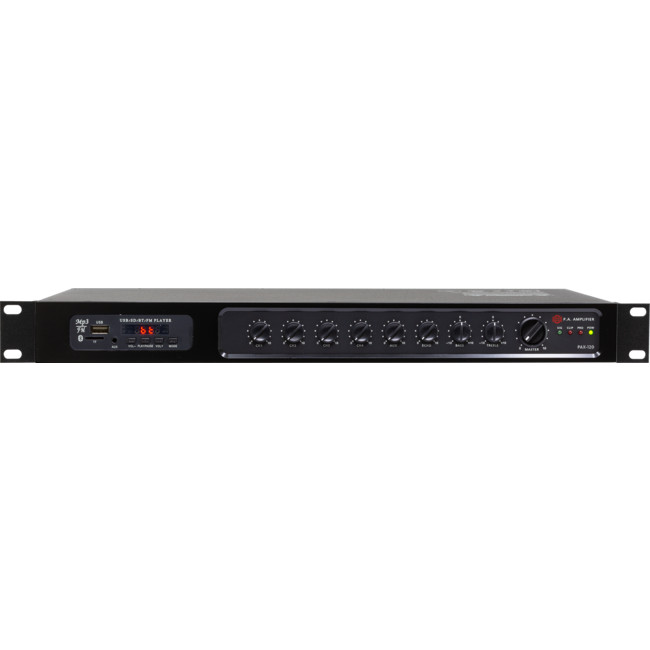 The PAX series offers three models of mixers/amplifiers designed for commercial applications. All models include a multi-source player, five input mixers, and a power amplifier module of 60W, 120W, or 240W driving low and high-impedance lines.