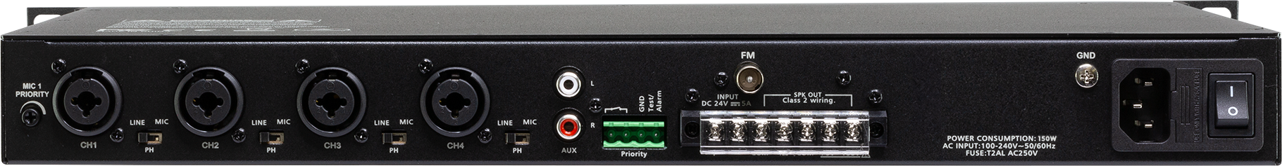 - 4ohm, 70V and 100V speaker level outputs