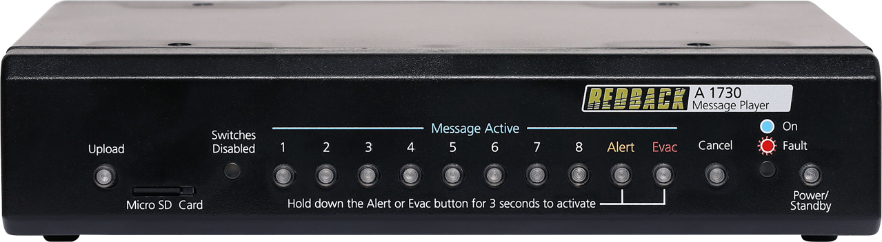 Box Contents 1 x A 1730 Message Player 1 x Micro SD card 1 x 24V 1.5A DC Plugpack 1 x Instruction Booklet