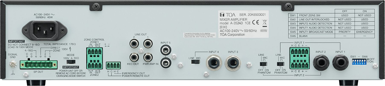 | Outputs | REC, LINE 1/1: 0 dBV, 600 ohms, unbalanced, RCApin jack SPEAKER direct, zones 1 and 2: 4-16 ohms in totalor 100 V |