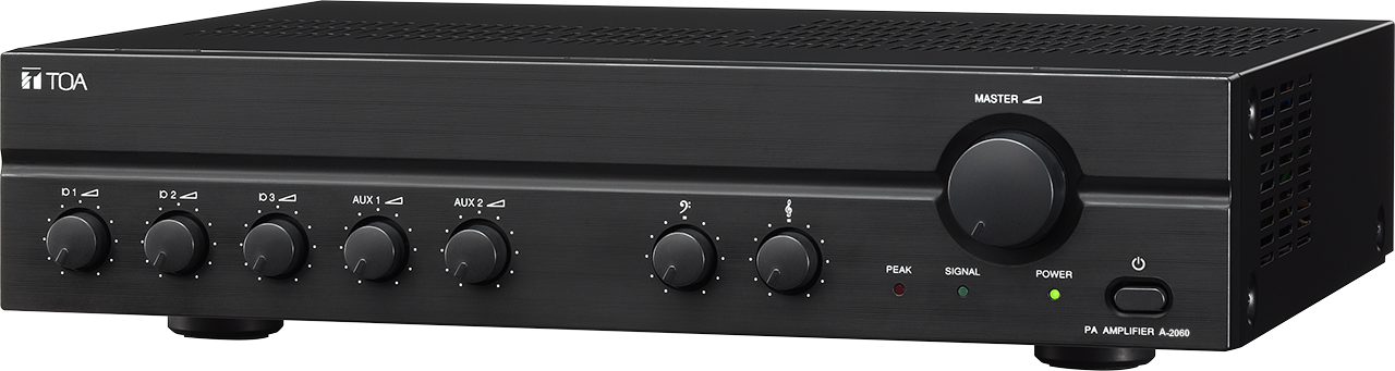 A-2000 Series Mixer Power Amplifiers are designed to behighly costeffective solutions to the demands of PA applications. They offer high levels of performance and versatility and are especiallywell-suited for broadcasting paging and supplying background music in schools, offices, shops, factories, mosques, churches, and large meeting rooms. The A-2000 series makes available a wide range of power outputs (A-2030: 30W, A-2060: 60W, A-2120: 120W, A-2240: 240W), with a frequency response of 50 – 20,000 Hz and distortion under 1%. Three balanced/XLR3-31 type MIC inputs and two unbalanced/RCA pin jack AUX inputs, along with high and low impedance balanced (floating) speaker outputs and unbalanced REC outputs ensure operational versatility.