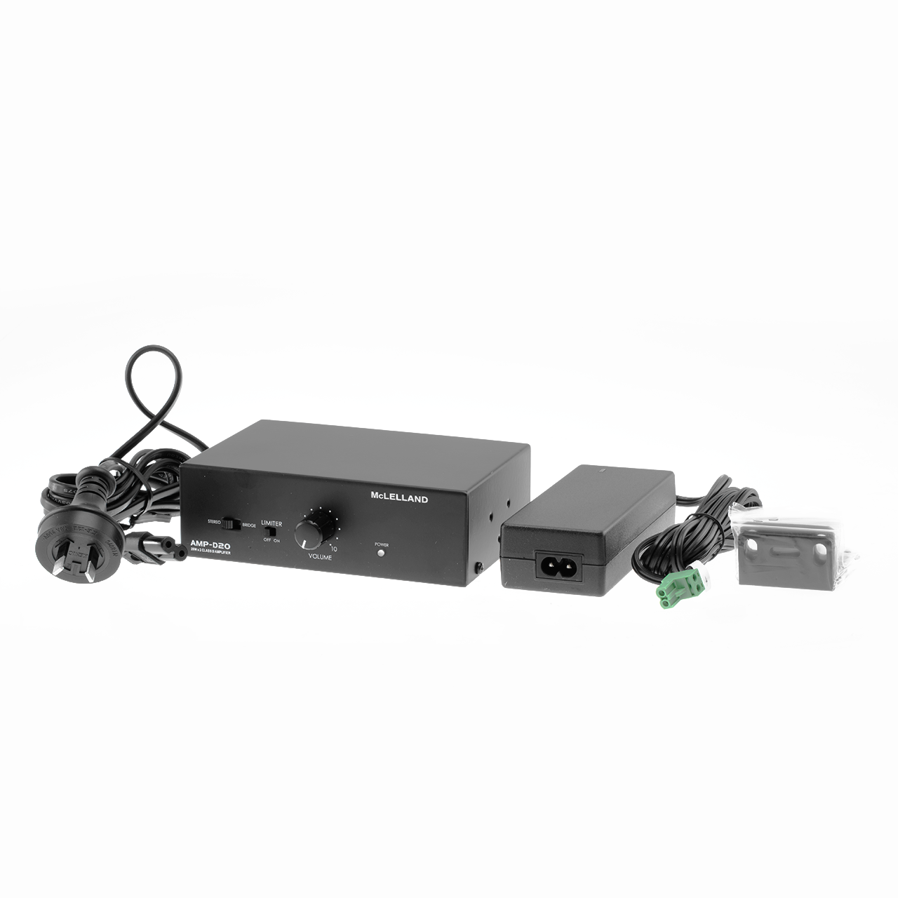 The AMP-D20 provides 17Wrms (20W max) of audio power to 4Ω (stereo) speakers. Perfect for in-wall/in-ceiling speakers, the AMP-D20 can be mounted on/in walls using the supplied mounting ears. It can also operate in Bridged mode to supply up to 31Wrms (40W max) to an 8Ω speaker.