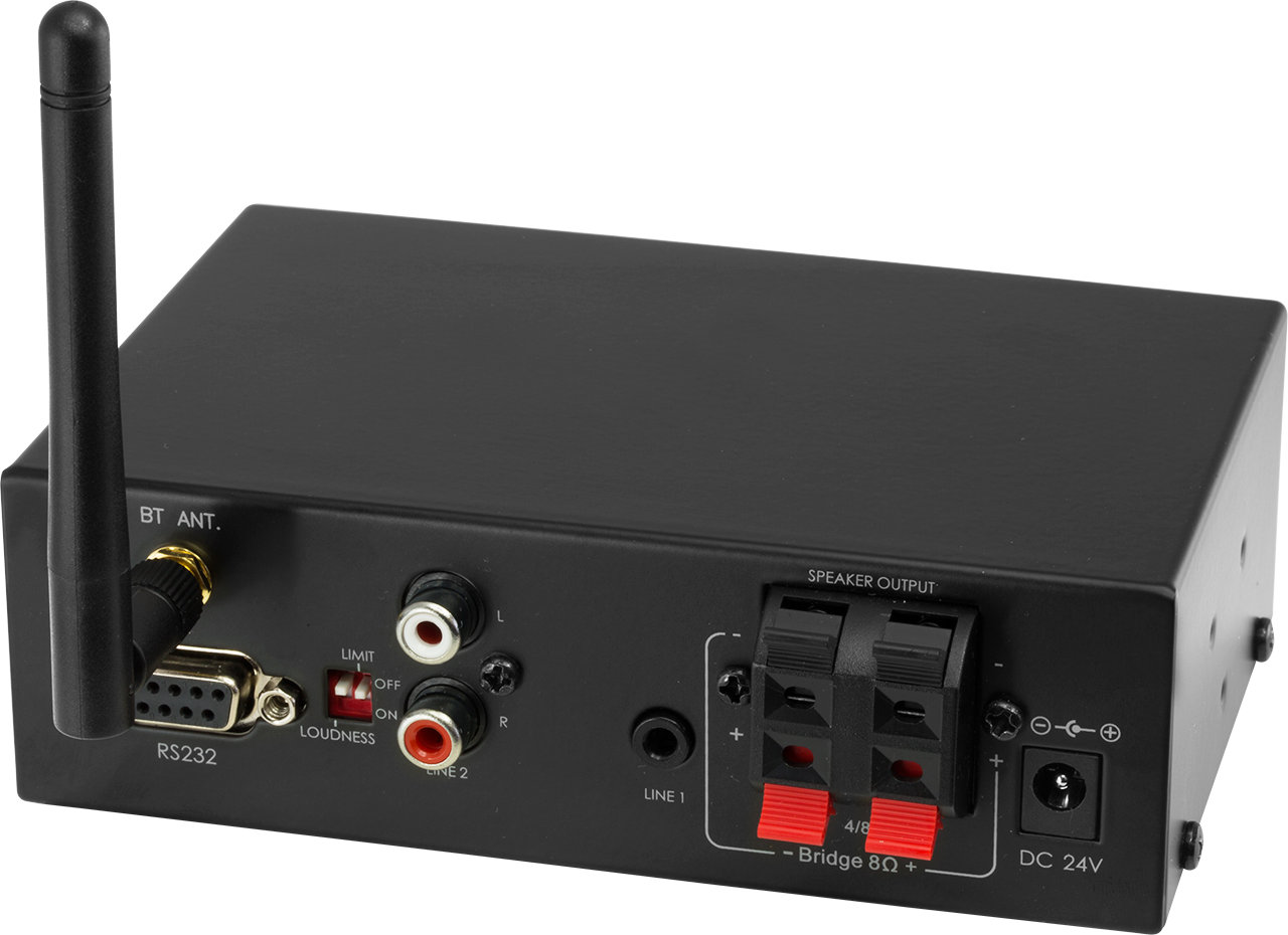 Efficient Class D design occupies little space and requires no ventilation, yet provides 20W RMS x 2CH output. It accepts two line level sources, with the internal Bluetooth receiver acting as the third input.Switchable limiter provides protection against being over driven in permanent installations. Switchable loudness control greatlyimproves overall sound quality when played at a low levels in office or home environments. 9-pin serial interface allows RS-232 control by external devices.