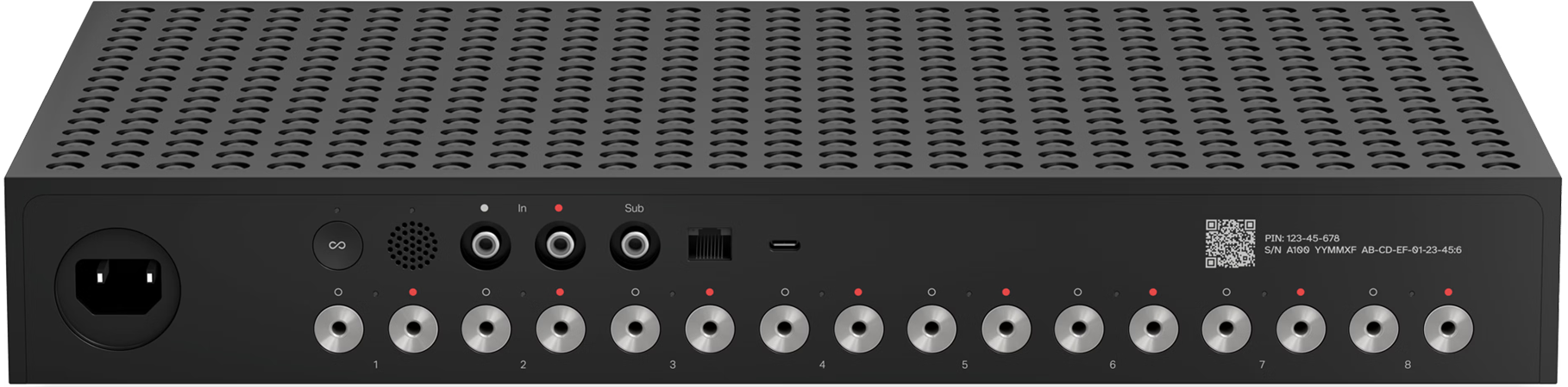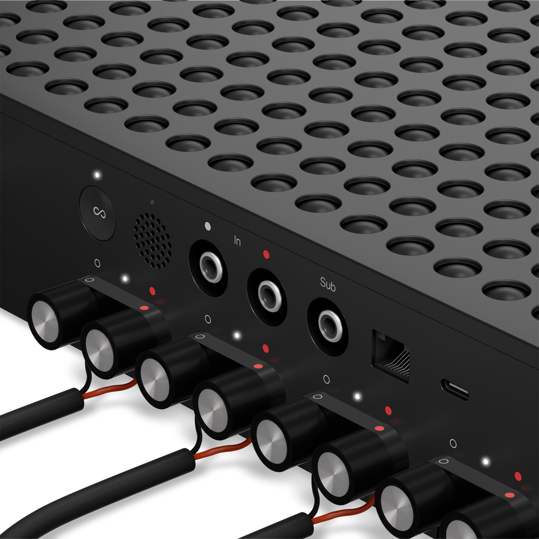 Speaker outputs automatically detect when a speaker is connected, while status LEDs provide real time feedback during setup. Ambient light sensing adjusts brightness to the environment, and all indicators are configerable in the app.