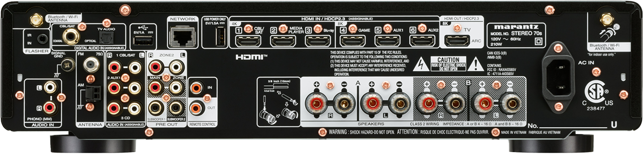 STEREO 70s merges the flexibility and features found in our CINEMA Series AVRs into a slim and simple 2 channel receiver. 8K HDMI plus ARC facilitates connection of smart TVs, game consoles and streaming systems. On screen display uses your TV screen to assist with setup. Support for up to 2 subwoofers means plenty of deep bass even when using small bookshelf speakers.