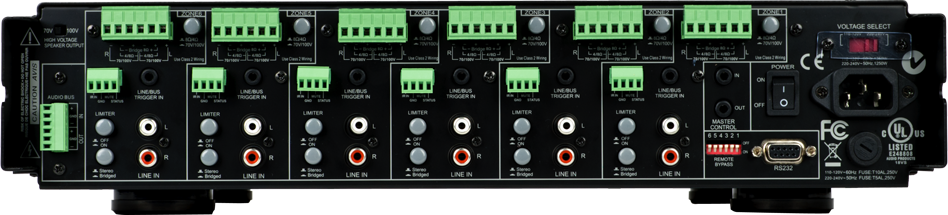 - 4Ω/8Ω, 8Ω bridged and 70/100V configurable- each zone
