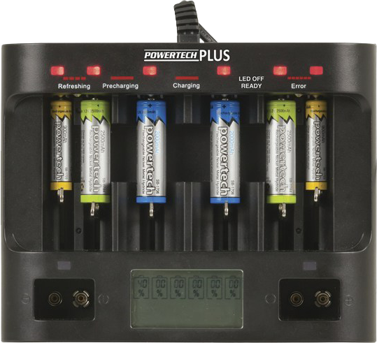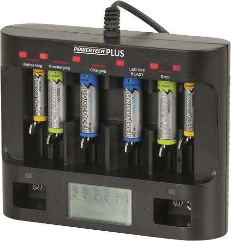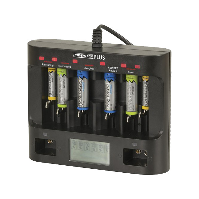 This is a powerful, yet flexible, fast charger for all those standard (AA/AAA/C/D) rechargeable cells (Ni-MH or Ni-Cd), up to 6 at a time, including 2 exclusive slots for 9V rechargeable batteries. Up to 1A charging per cell (depending on size) means typical AA cells will only take a couple of hours to charge. Feedback on charging status is provided thanks to an informative LCD panel and status lights. This unit does not charge rechargeable Lithium or Alkaline cells.