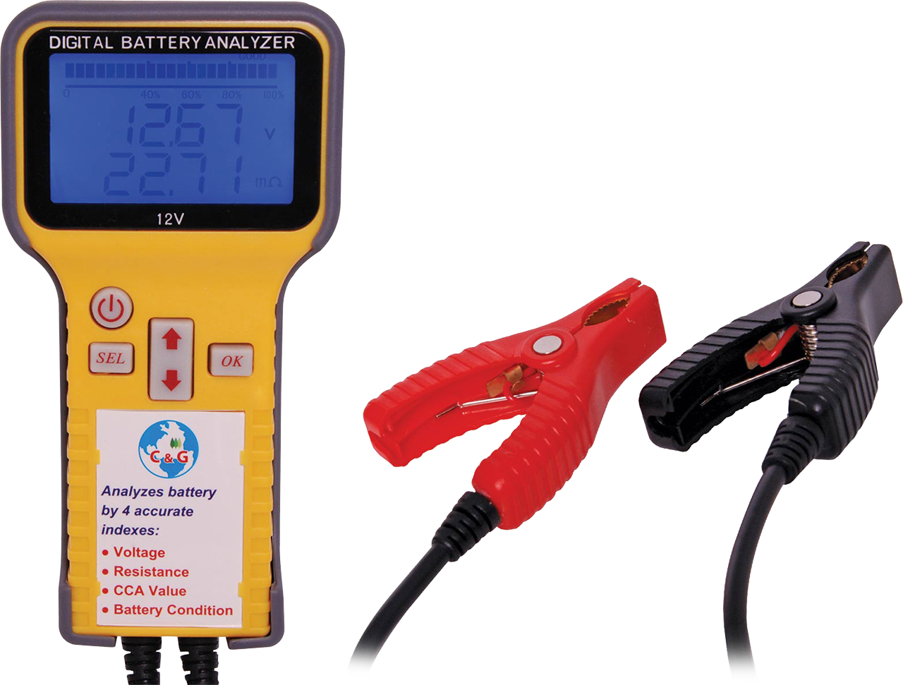 Detects and analyses battery voltage, cold cranking amperes (CCA), resistance (mO) and battery cell condition. Suitable for use with cars, trucks, busses, boat, forkliftsand motorcycles - anywhere a 12 Volt lead acid battery is used. Includes heavy duty wide entry croc clip cables. Veryeasy to use, simply connect to the battery, turn tester on, and press OK to enter the testing modes.