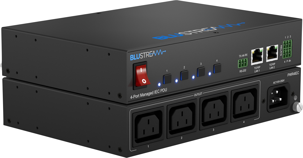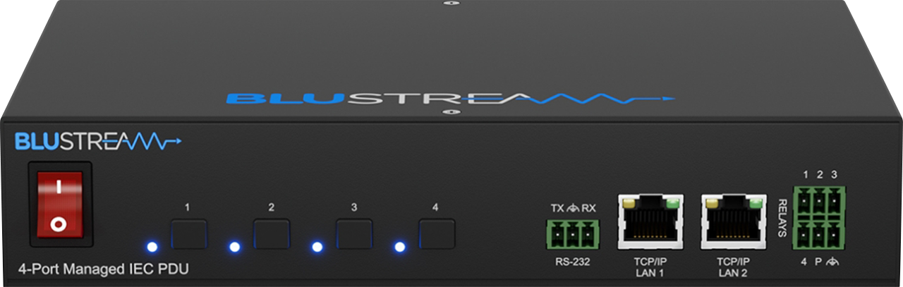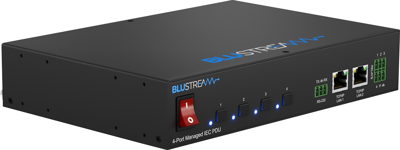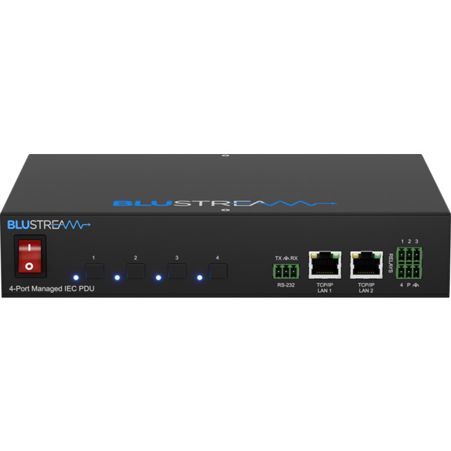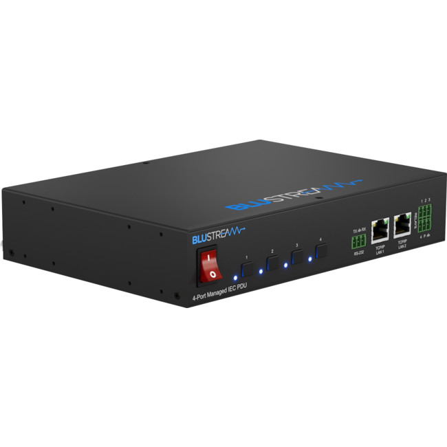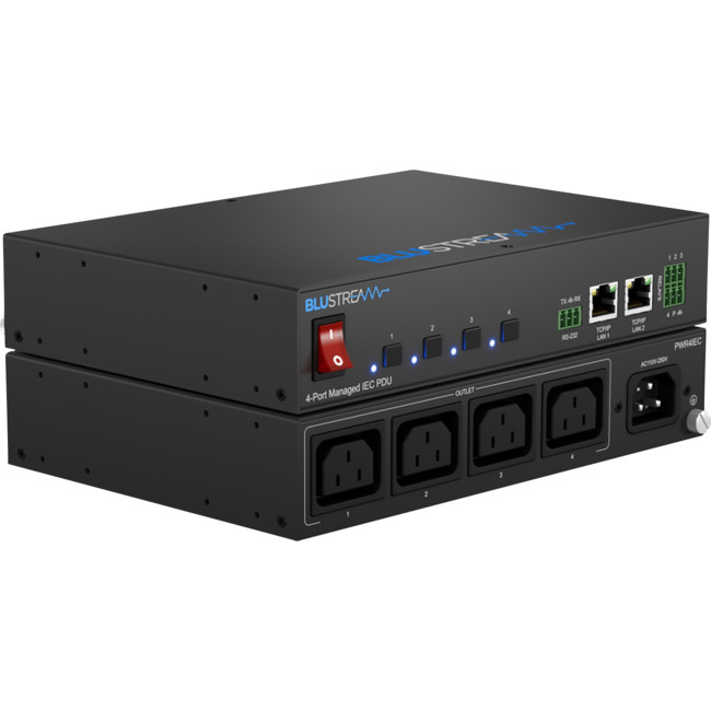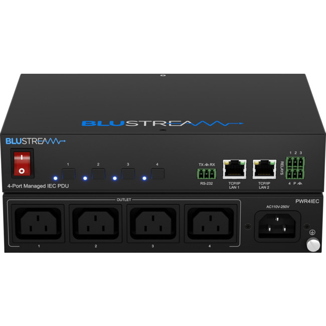 The PDU supports TCP/IP and RS-232 control, with a redundant TCP/IP port as a back-up. Front panel buttons for manual switching of power to individual outlets, and a single mains switch for overall system power.