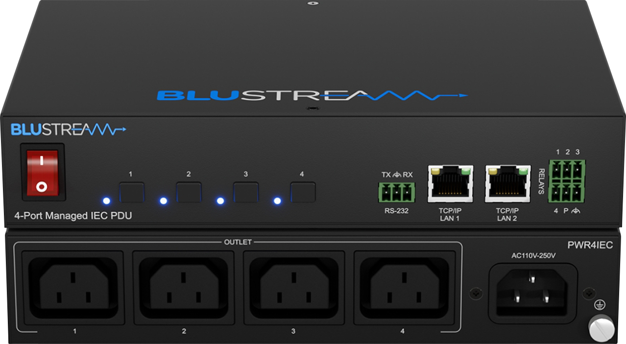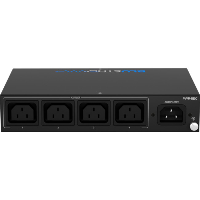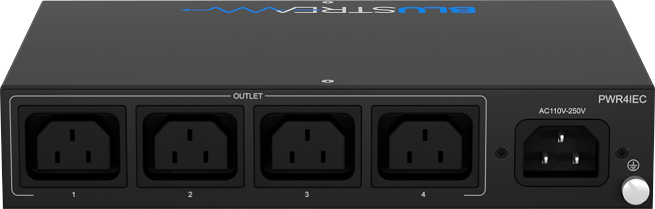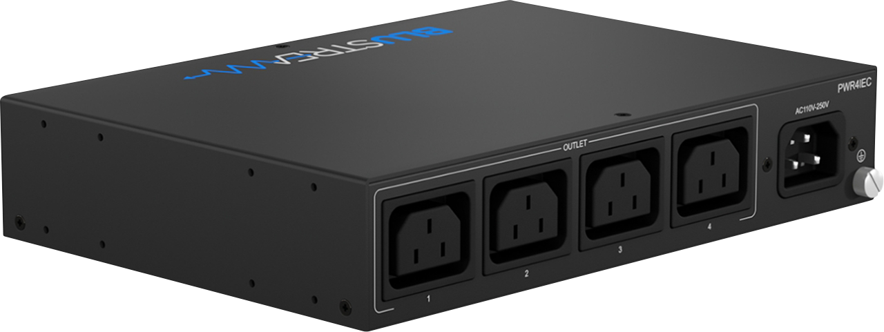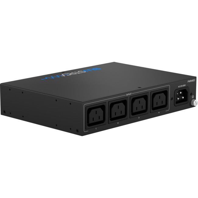 The PWR4IEC is an outlet-level metered and switched smart PDU. The unit features 1 × IEC C14 inlet for power (110-250V at up to 10A) and 4 × IEC C13 output outlets for supply to high-power consumption devices.