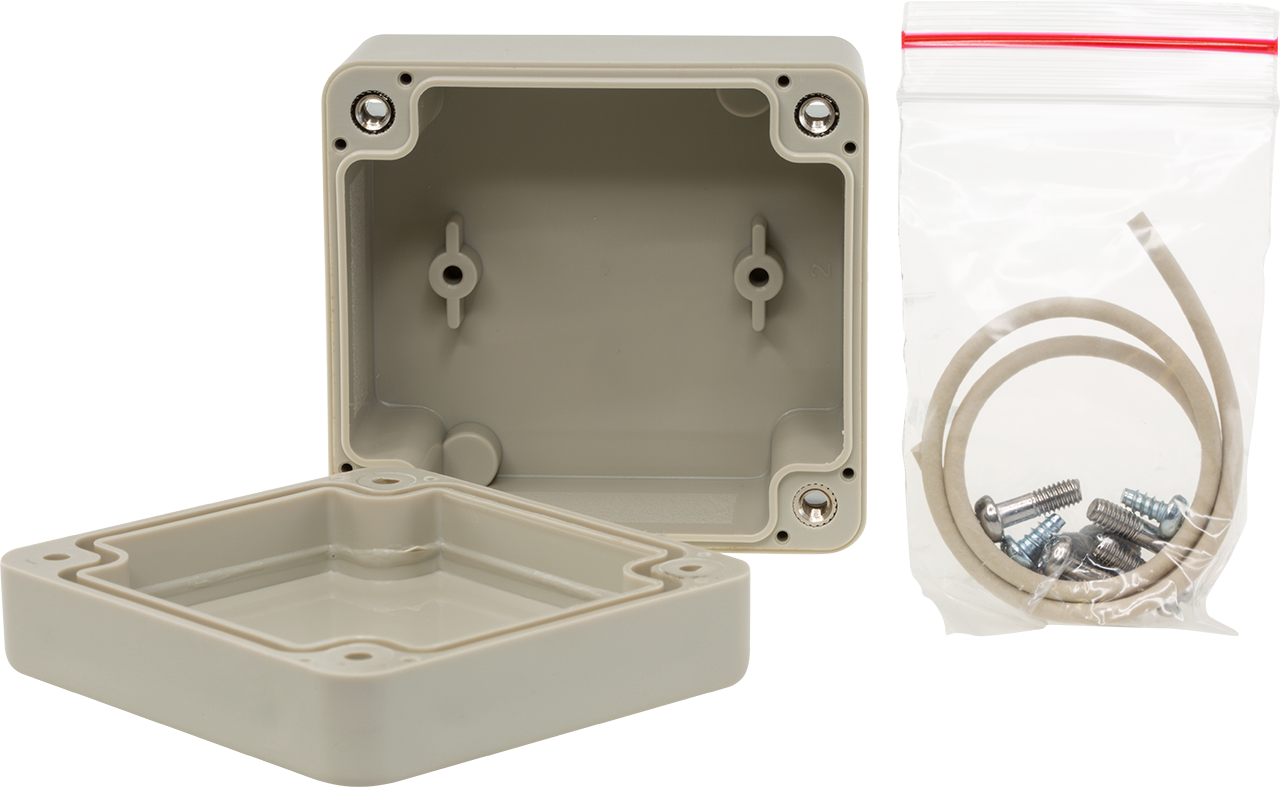 Light grey ABS box. Easily drilled or punched, suitable for use in theelectrical and electronics industries as circuit enclosures and junction boxes.The lid and base incorporate a tongue and groove sealing system with gasket.The wall mounting holes and lid fixing screws are outside the sealing area,thus preventing the ingress of moisture and dust. Lids are retained by four screws into threaded inserts.