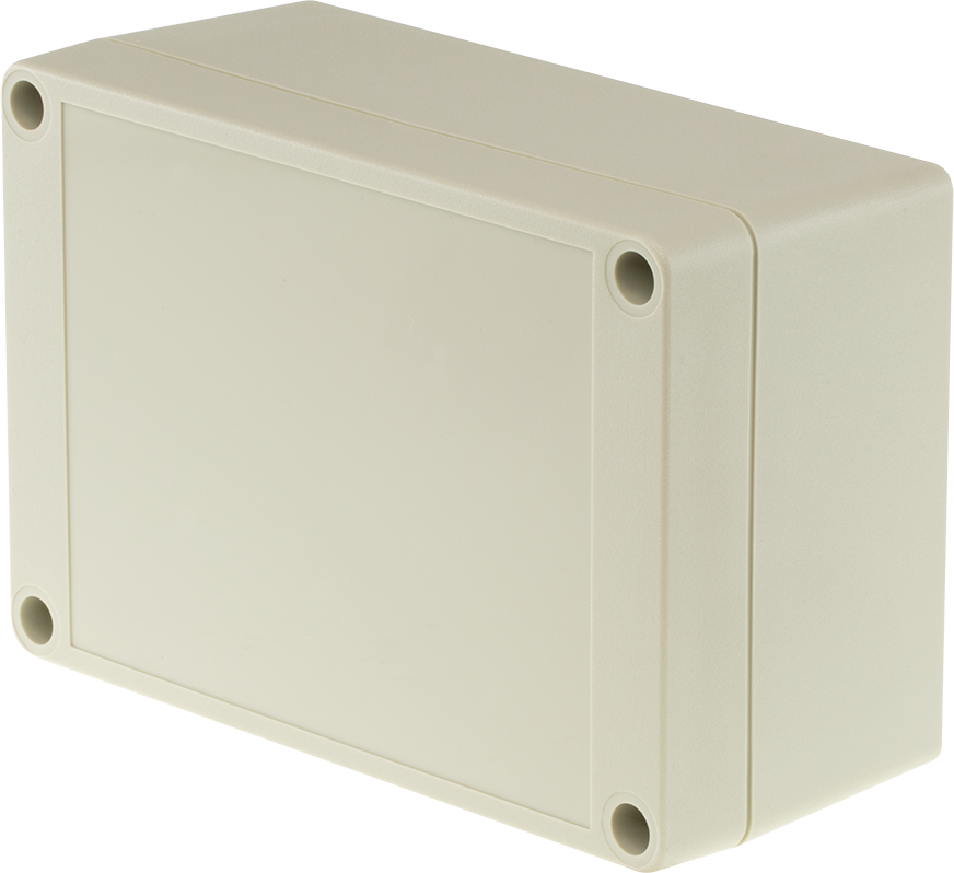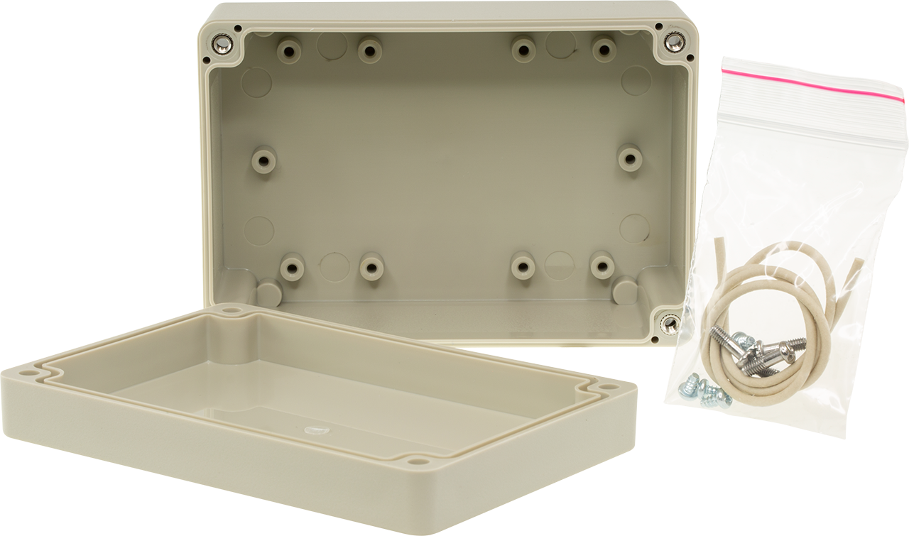 Light grey ABS box. Easily drilled or punched, suitable for use in theelectrical and electronics industries as circuit enclosures and junction boxes.The lid and base incorporate a tongue and groove sealing system with gasket.The wall mounting holes and lid fixing screws are outside the sealing area,thus preventing the ingress of moisture and dust. Lids are retained by four screws into threaded inserts.