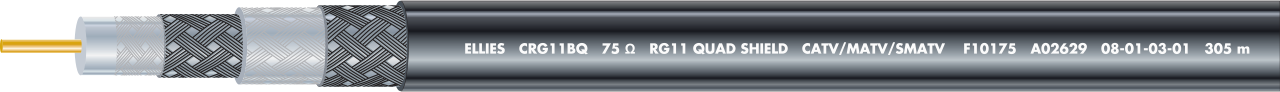 1.63mm/14 AWG solid bare copper covered steel conductor with gas injected foam polyethylene insulation. Foil tape, 60% aluminium braid, foil tape, 40% aluminium braid and a black PVC jacket.