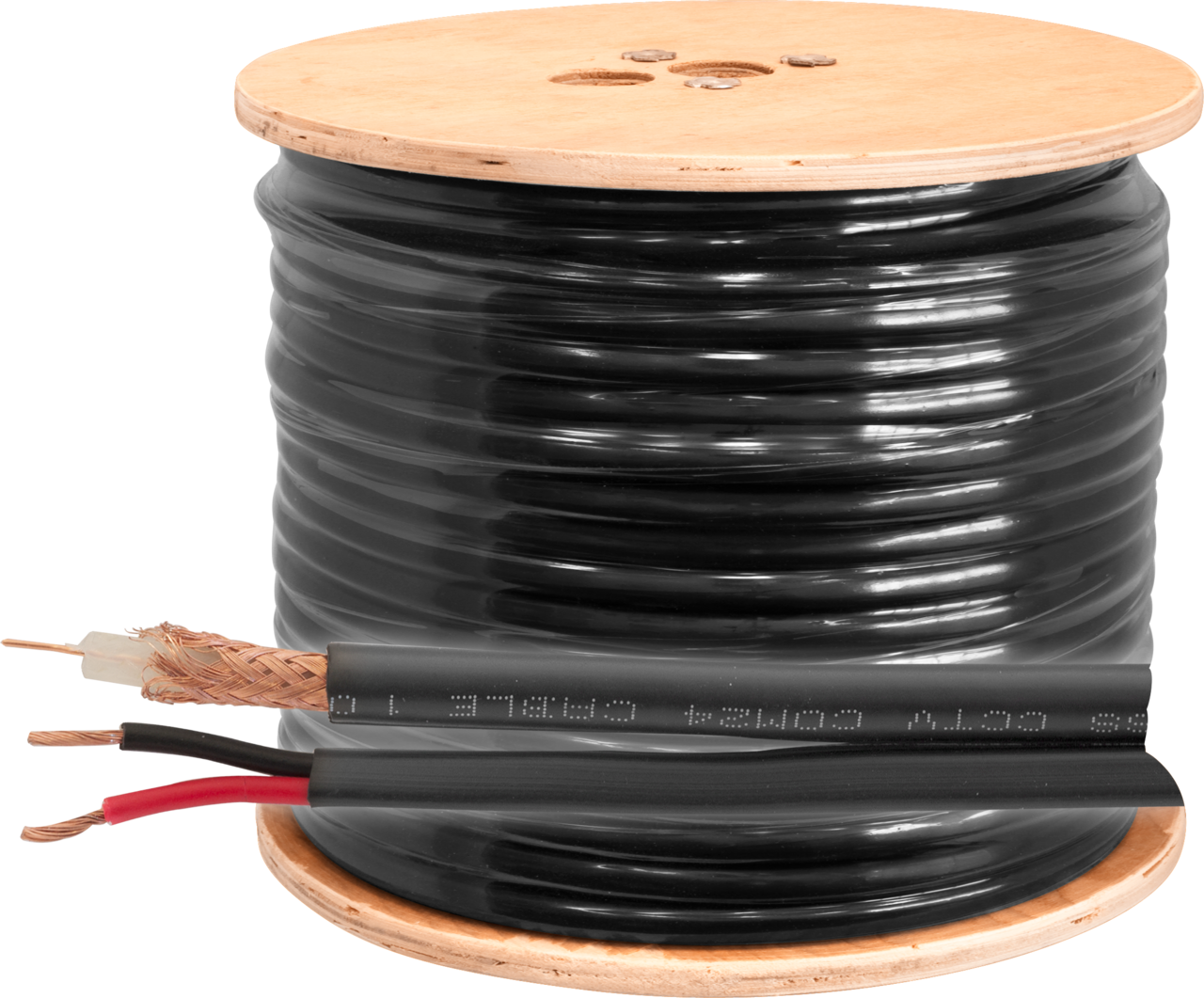 RG59 Video Coax, plus heavy duty 2 core fig. 8 camera power cable with tracer in tough outer sheath.. Designed for commercial applications.