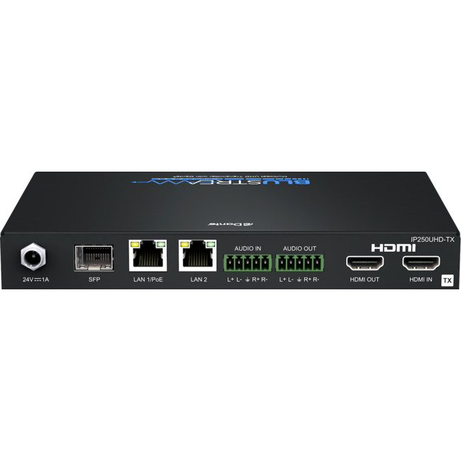 Compatible with the current IP200 platform, the IP250UHD-TX is an industry leading 4K HDCP 2.2 HDMI transmitter that, using visually lossless compression technology, delivers 10GB HDMI, bi-directional IR, RS-232 & USB/KVM up to lengths of 100m over standard network architecture, or greater distances using the in-built fibre SFP port.