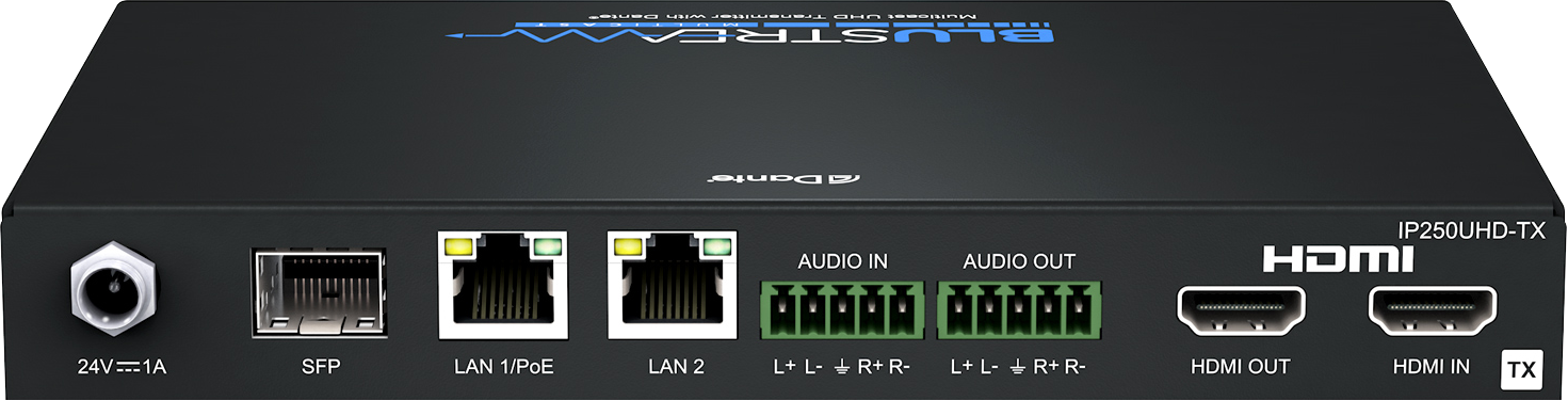 The IP250UHD-TX features dual RJ45 network ports for independent or combined HDMI and/or Dante signal distribution.