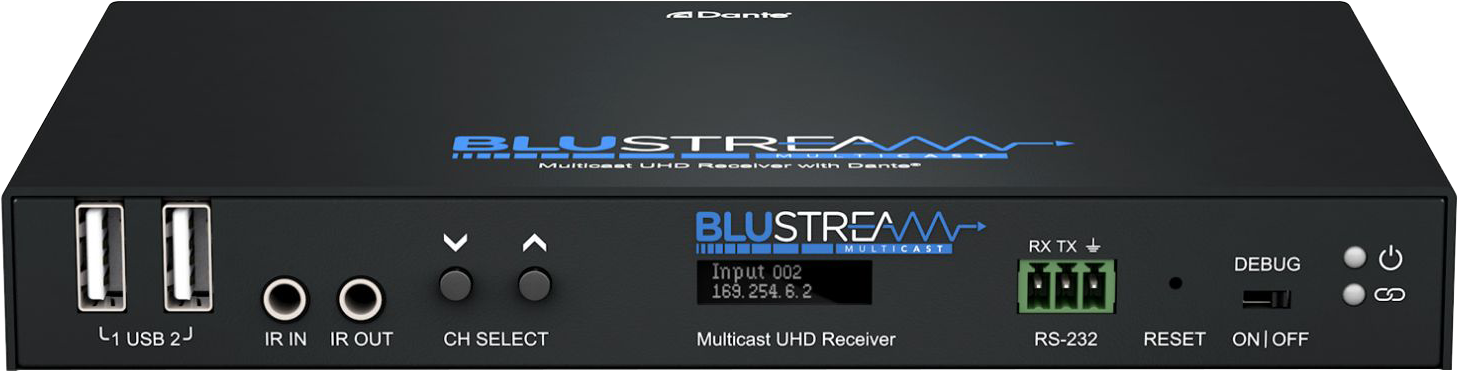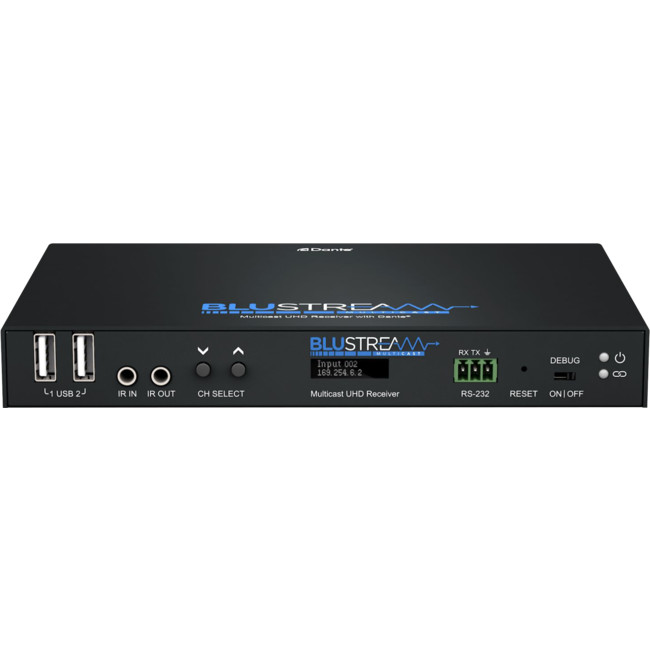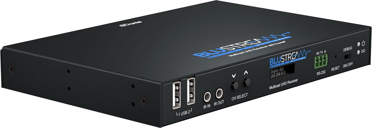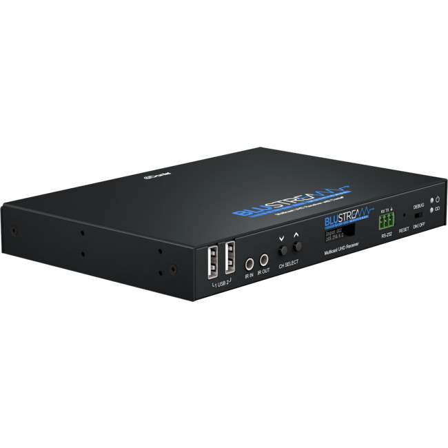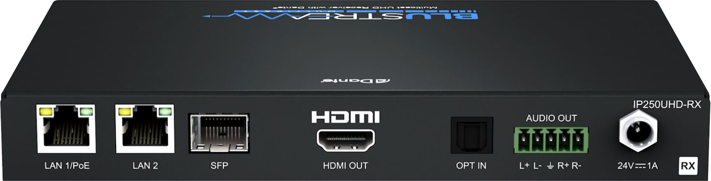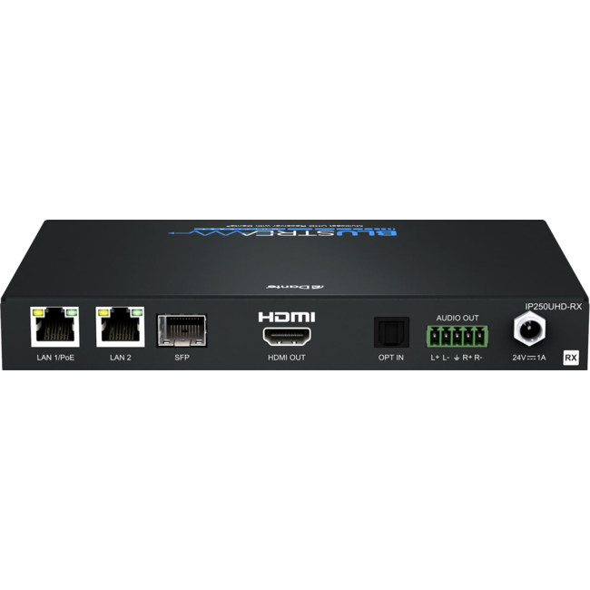 Blustream's UHD Multicast distribution platform allows virtually latency free (1 frame) distribution of HDMI video over a 1GB Managed Network. Compatible with the current IP200 platform, the IP250UHD-RX is an industry leading 4K HDCP 2.2 HDMI video scaling receiver that, using visually lossless compression technology, delivers 10Gb HDMI, Bi-directional IR, RS-232 & USB/KVM up to lengths of 100m over standard network architecture, or greater distances using the in-built Fibre SFP port. The IP250UHD-RX features dual RJ45 network ports for independent or combined HDMI and/or Dante signal distribution. The unit can be powered via PoE from the network switch or locally should the switch not support PoE. With multiple configuration options available, the Multicast solution is ideal for both commercial and residential installations.