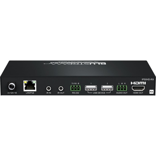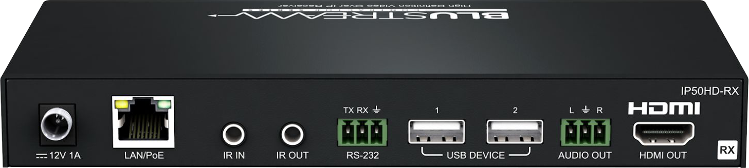 Blustreams Contractor Series HD distribution platform allows distribution of AV and control signals over a 100Mbps network. The IP50HD-RX is an industry leading 1080p HDMI video scaling receiver that, using H.265 compression technology, delivers HDMI, Bi-directional IR, RS-232 & USB/KVM up to lengths of 100m over standard network architecture. The receiver can be powered via PoE from the network switch or locally should the switch not support PoE. With multiple configuration options available the Multicast HD solution is ideal for both commercial and residential installations.