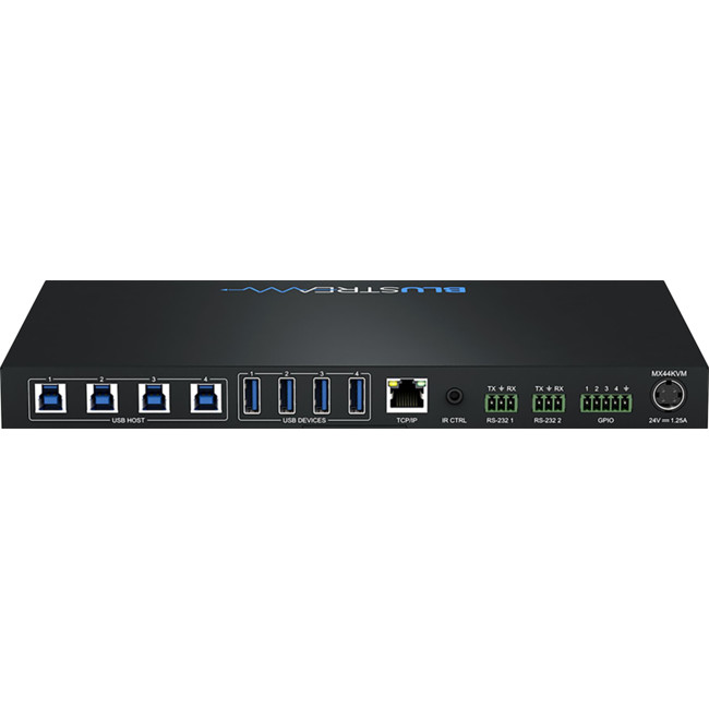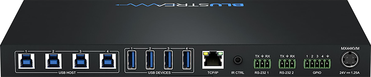 An RS-232 loop-through connection allows for the MX44KVM to be intrinsically linked to any Blustream video matrix product for the addition of KVM support to our video-only switching products.