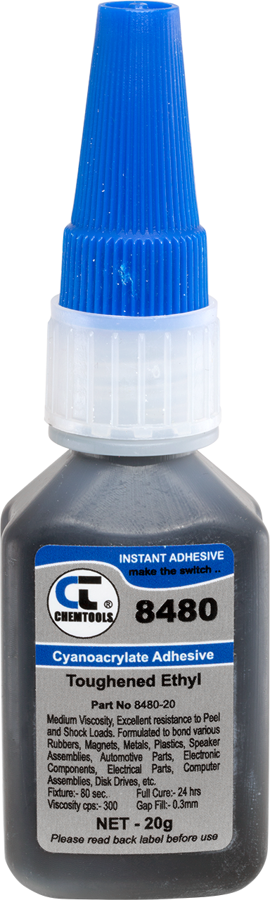 Cyanocrylate adhesives offer a major advantage over other types of adhesive systems. They are a single componentadhesive, fast curing at room temperature, solvent free and resistant to many environmental factors. ChemTools 8480 is medium viscosity combined with fast cure speed, and excellent resistance to peel and shock loads. It is specially formulated to bond various Rubbers, Metals and Plastics for use in difficult environments.