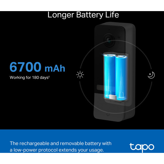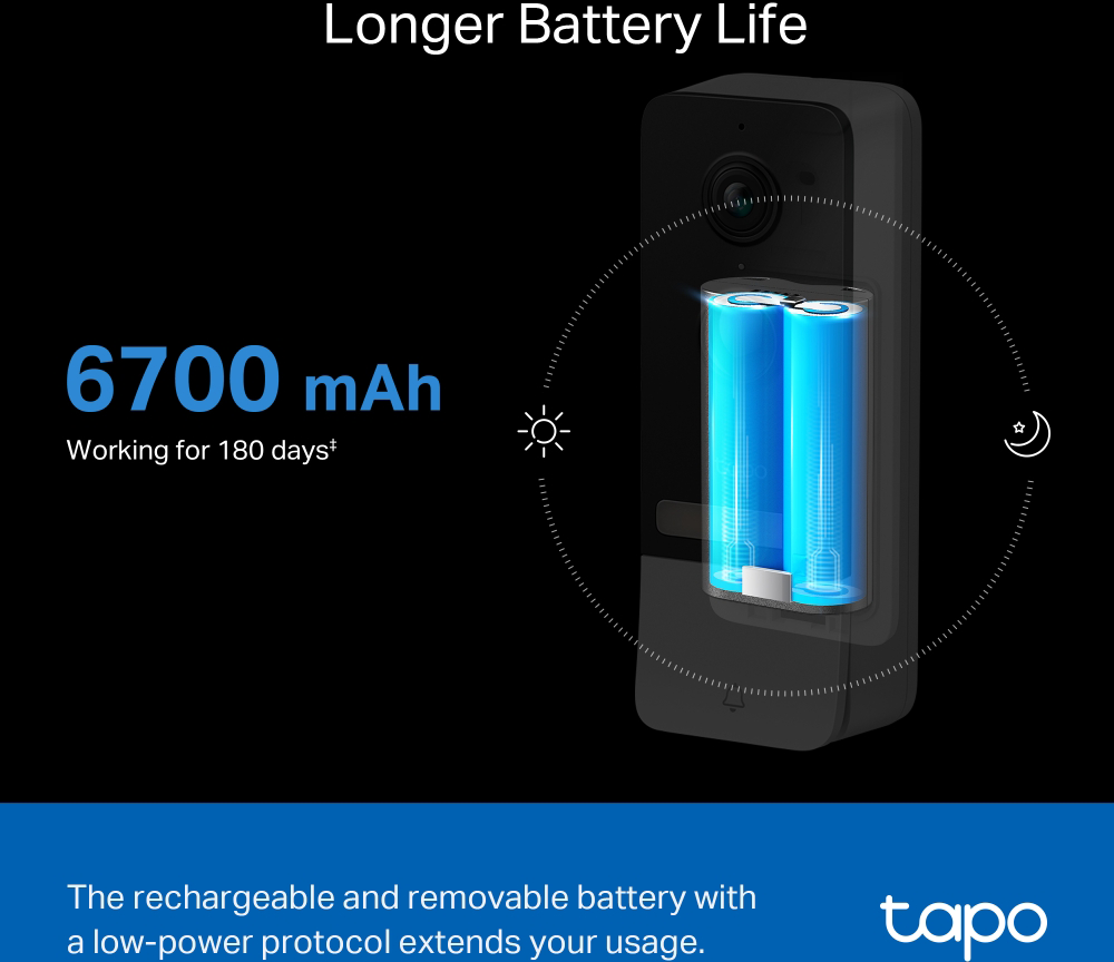 2: Battery life of up to 180 days is based on TP-Link's laboratory testing triggering 10-20 events per day. Actual battery life may vary based on device settings.