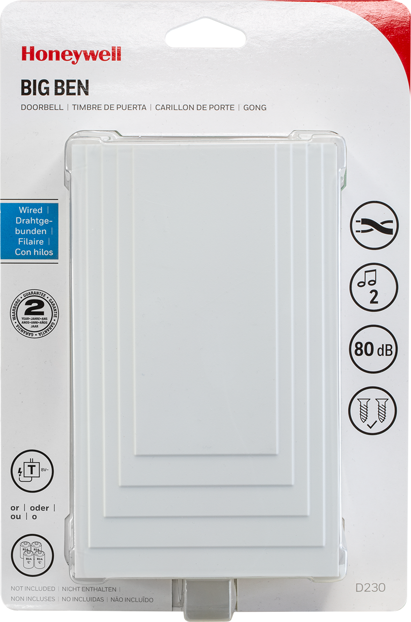 A door chime with a classic black & white design. 4 x 'C' batteries or D780 transformer (not inc.) Size: 171x105x48mm