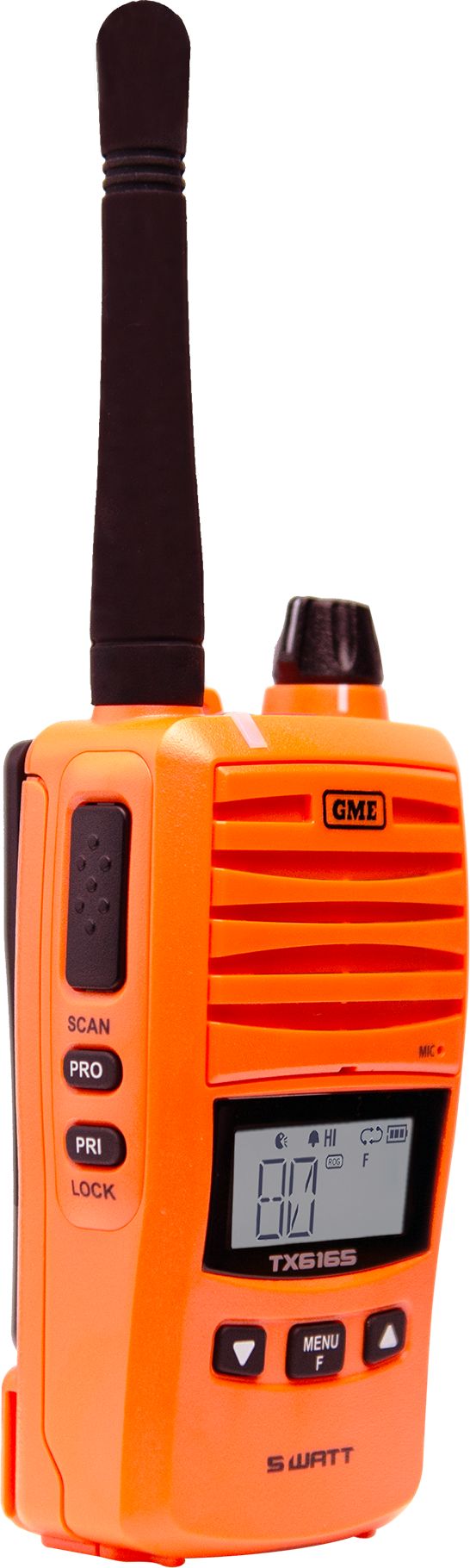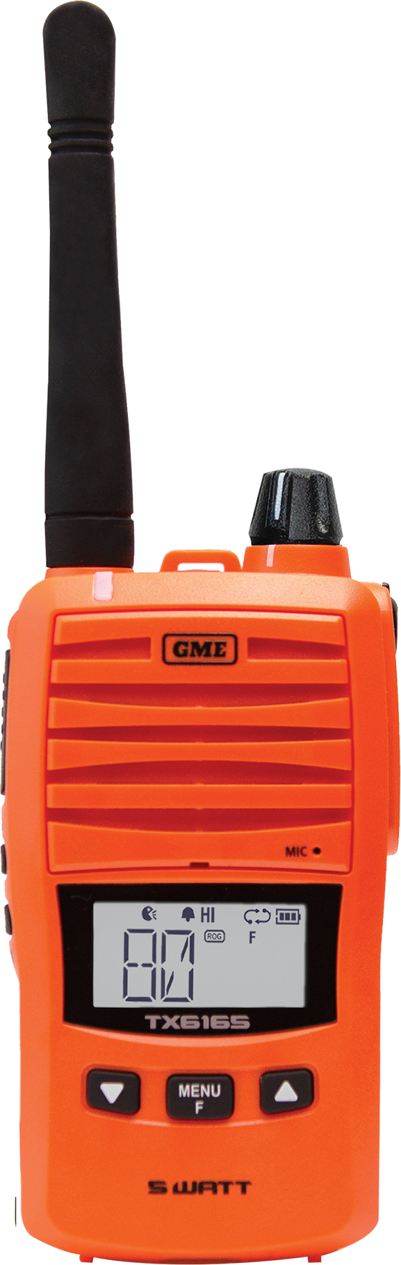 The TX6165 is GME’s newest 5W Handheld UHF CB radio. New, class-leading features such as the large, high-contrast LCD display, 2 Watt speaker, and a user-programable button makes it stand out from the field.
