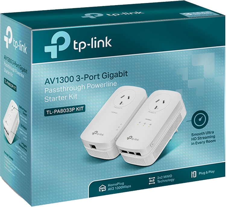 Advanced HomePlug AV2 technology means the TL-PA8033P KITsupports 2×2 MIMO* with beamforming, so users benefit from ultra-fast data transfer speeds of up to 1300Mbps. Perfect for band width demanding activities like streaming Ultra HD video to multiple devices simultaneously, online gaming and large file transfers.