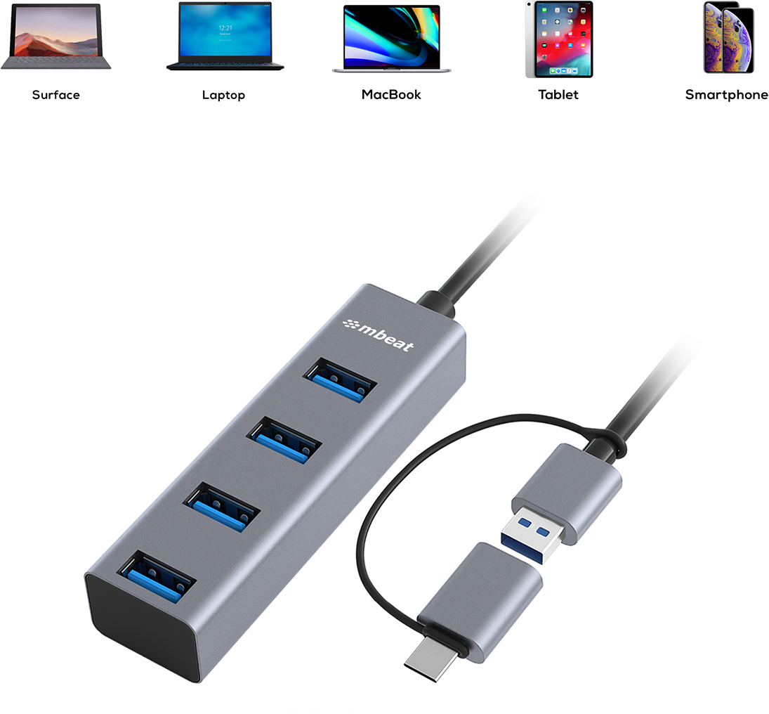 Maximize the utility of your laptop with a portableplug-and-play hub that doesn’t require any driver installation or external power; simply plug into a USB 3.0/USB-C port to instantly expand to four USB 3.0 ports for high-speed data transfers and multiple USB peripherals. Compatible withboth USB 3.0 and USB-C ports!