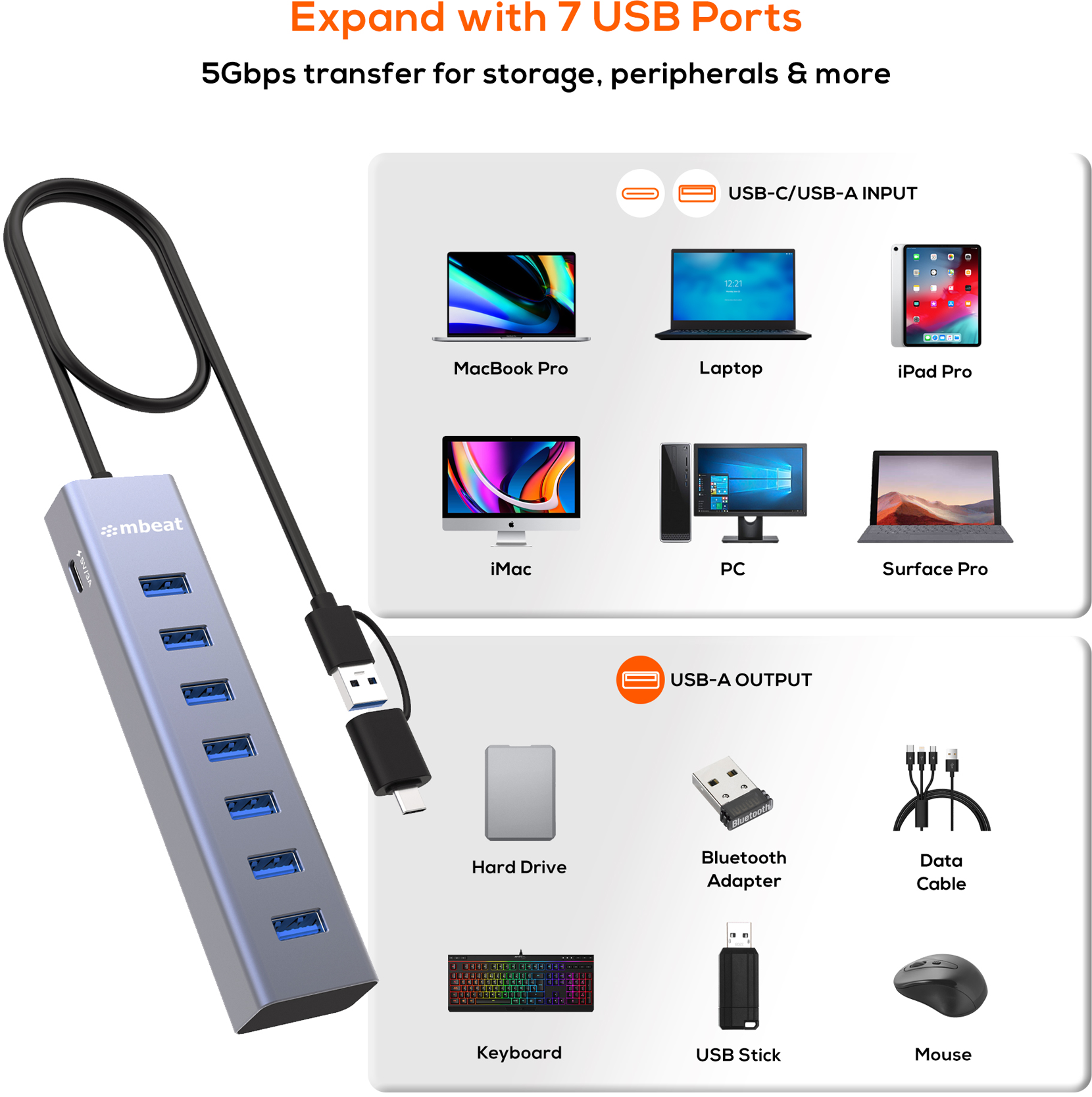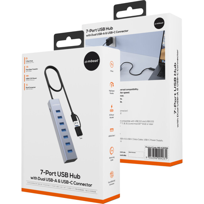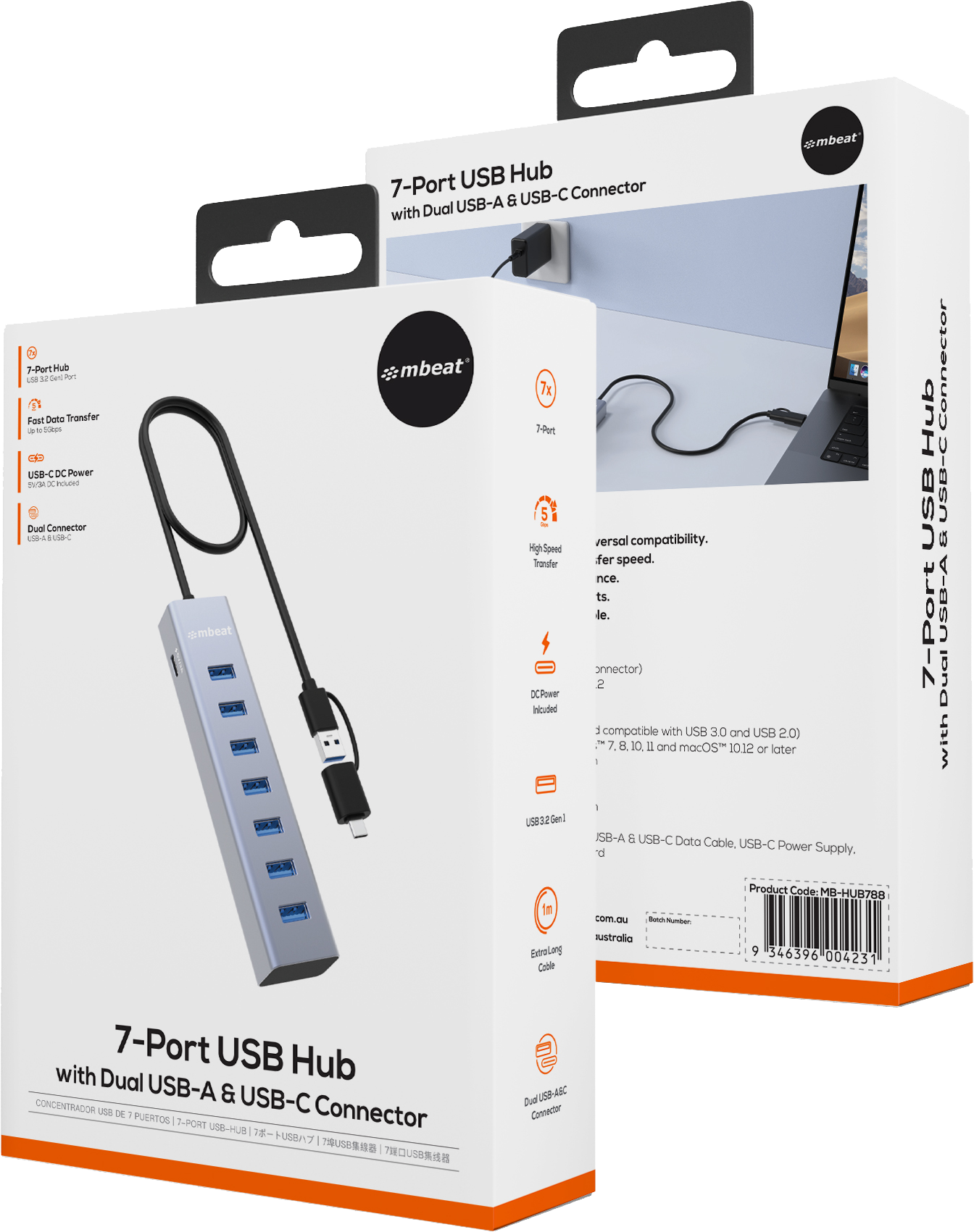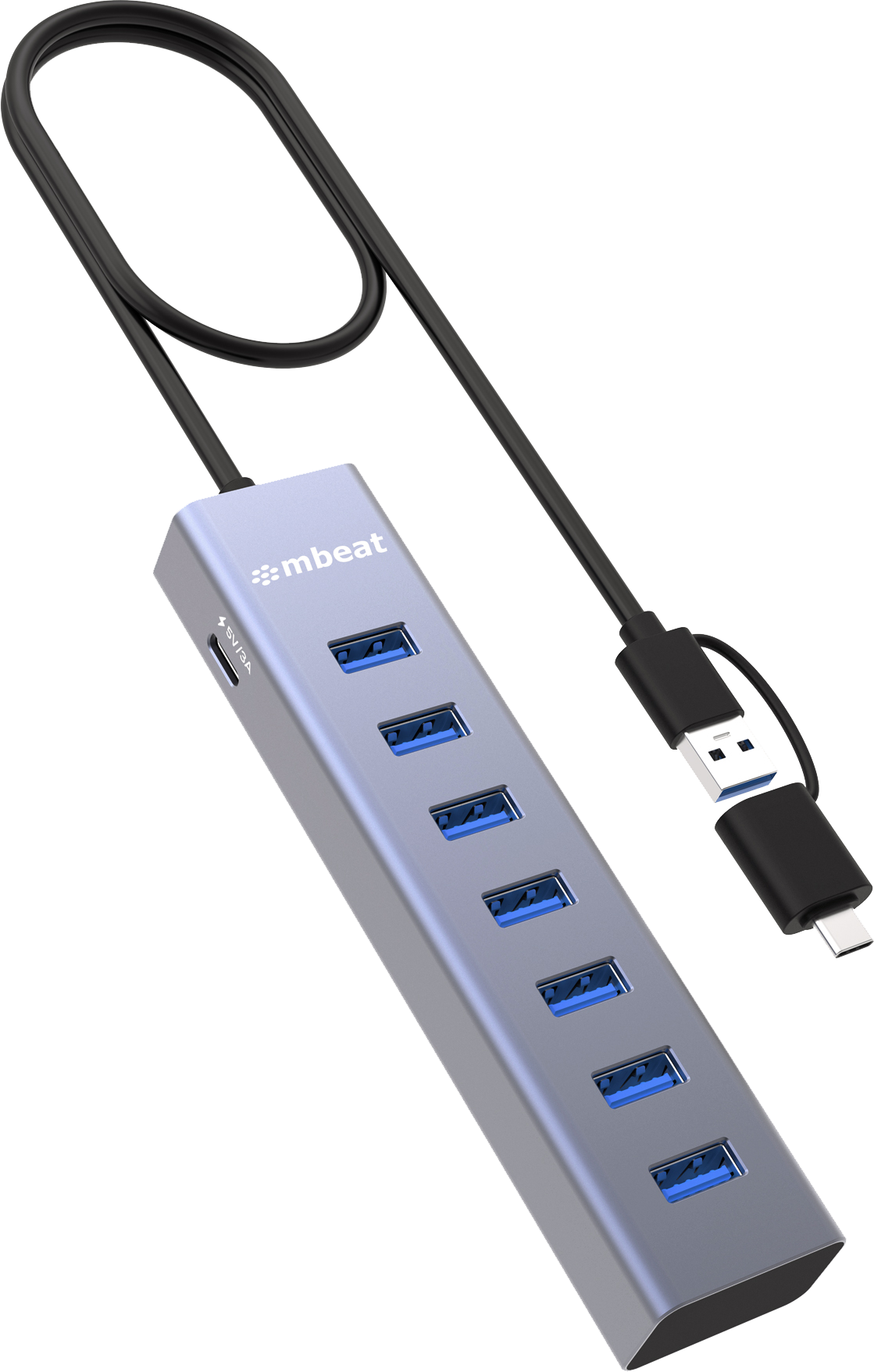 Seamlessly expand your connectivity with the mbeat 7-Port USB Hub — a compact solution for high-speed data transfer and universal compatibility. Featuring seven USB-A ports, a dual USB-A & USB-C host connector, and a USB-C power input, it’s built for both modern and legacy systems. With a premium aluminium build and a 1-metre extended cable, it offers reliable performance and flexible placement in any setup.