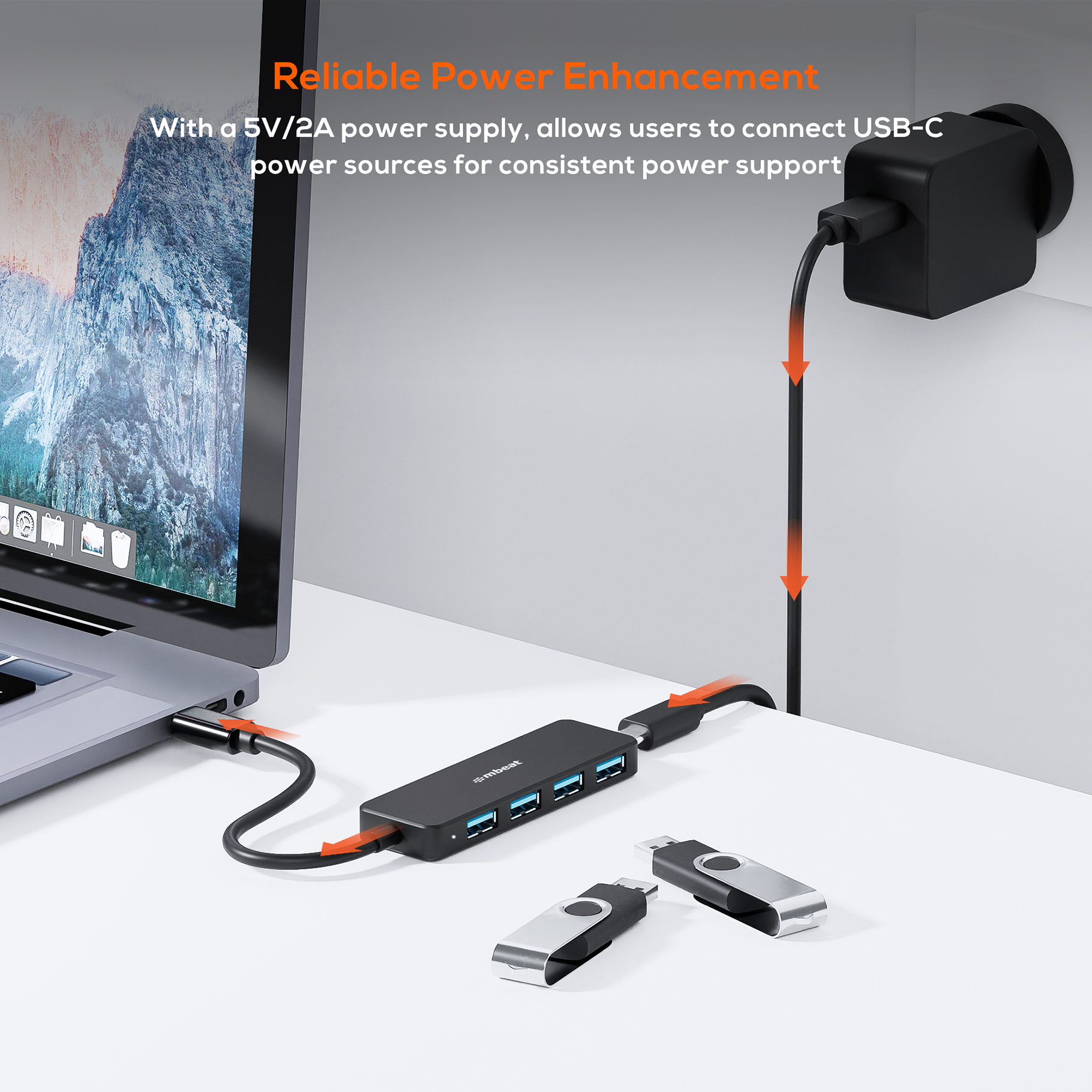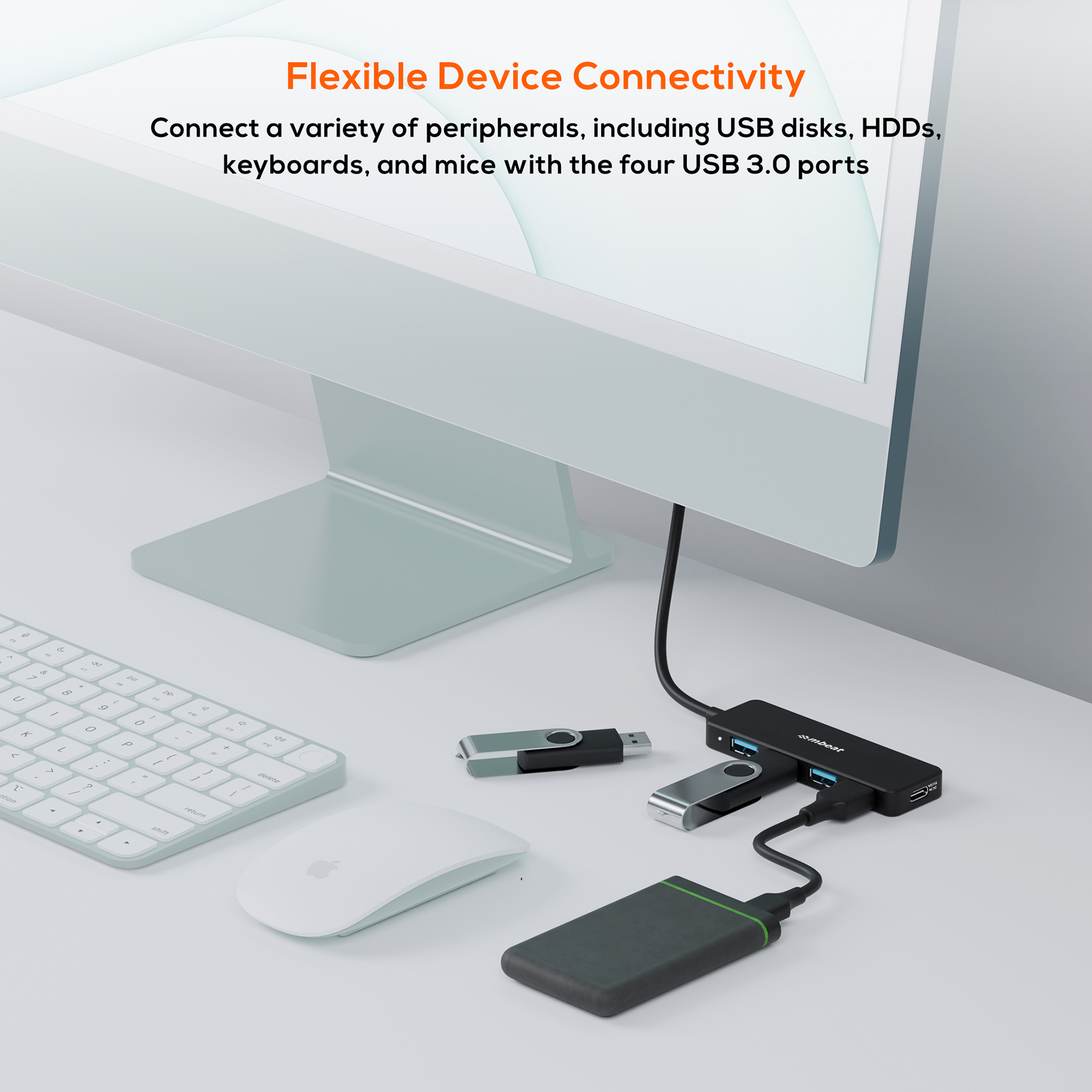 - Expand your USB-C laptop with four USB 3.0 ports, offering swift 5Gbps data transfer.